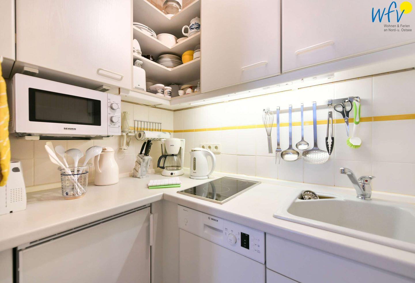 Die Einbauküche - u.a. mit Zwei-Plattenherd, Mikrowelle und Geschirrspüler - ermöglicht Ihnen, sich in der Ferienwohnung bequem selbst zu verpflegen.