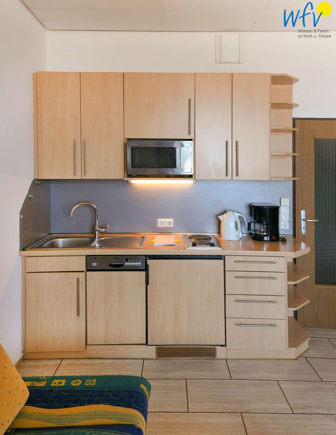 Schon beim gemütlichen Urlaubsfrühstück können Sie vom Essplatz aus die Wellen beobachten. Da bekommt man direkt Lust auf einen Strandspaziergang oder einen Badetag! Während Sie schon den Rucksack packen, erledigt die Spülmaschine den Abwasch für Sie. Auch für Snacks oder das Dinner am Abend ist die praktische Küchenzeile komplett ausgestattet.