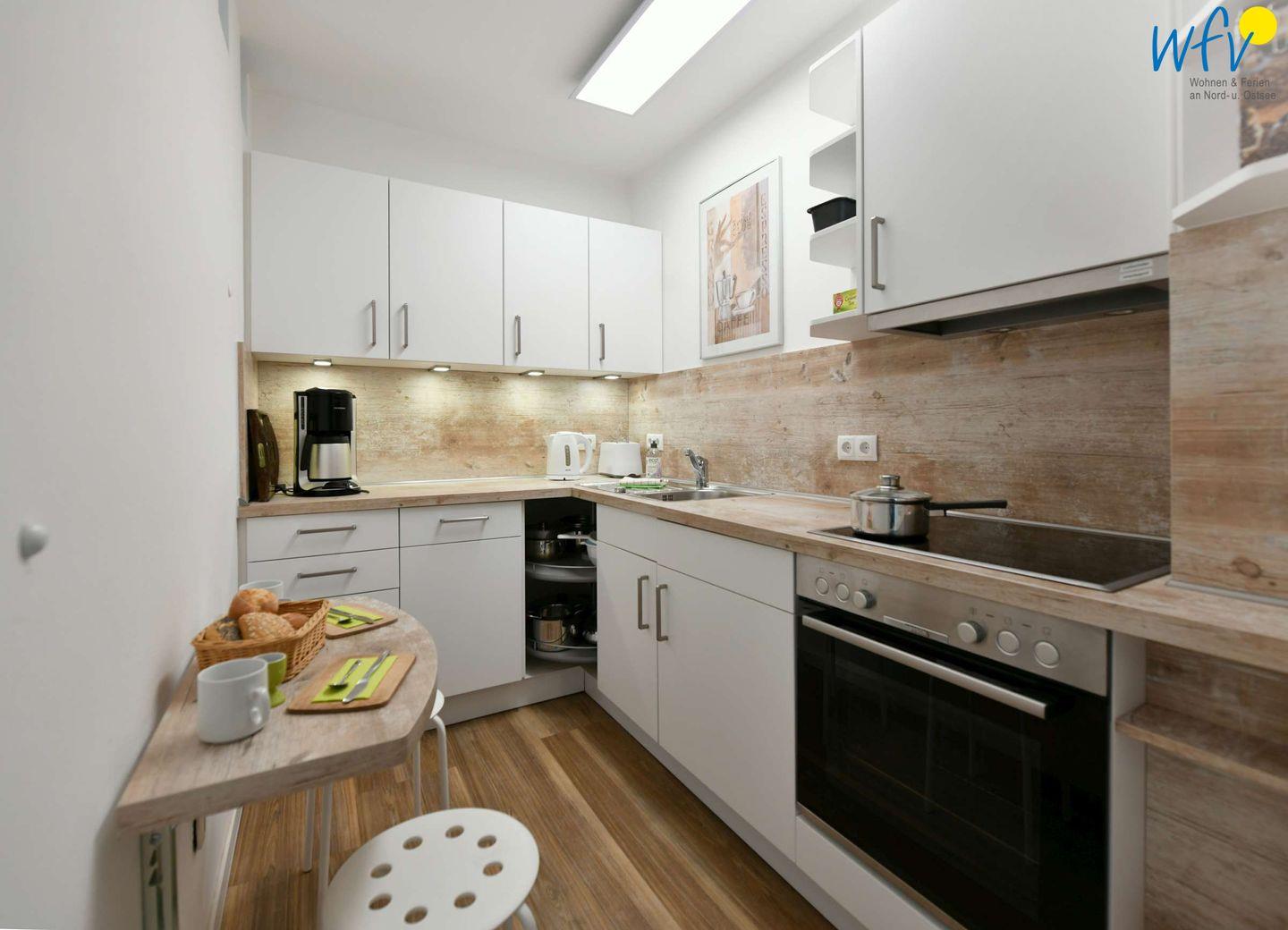 Die Ferienwohnung verfügt über einen Wohnbereich mit Couchecke und Essplatz, ein separates Schlafzimmer, eine komplett ausgestattete Küche und ein Bad.