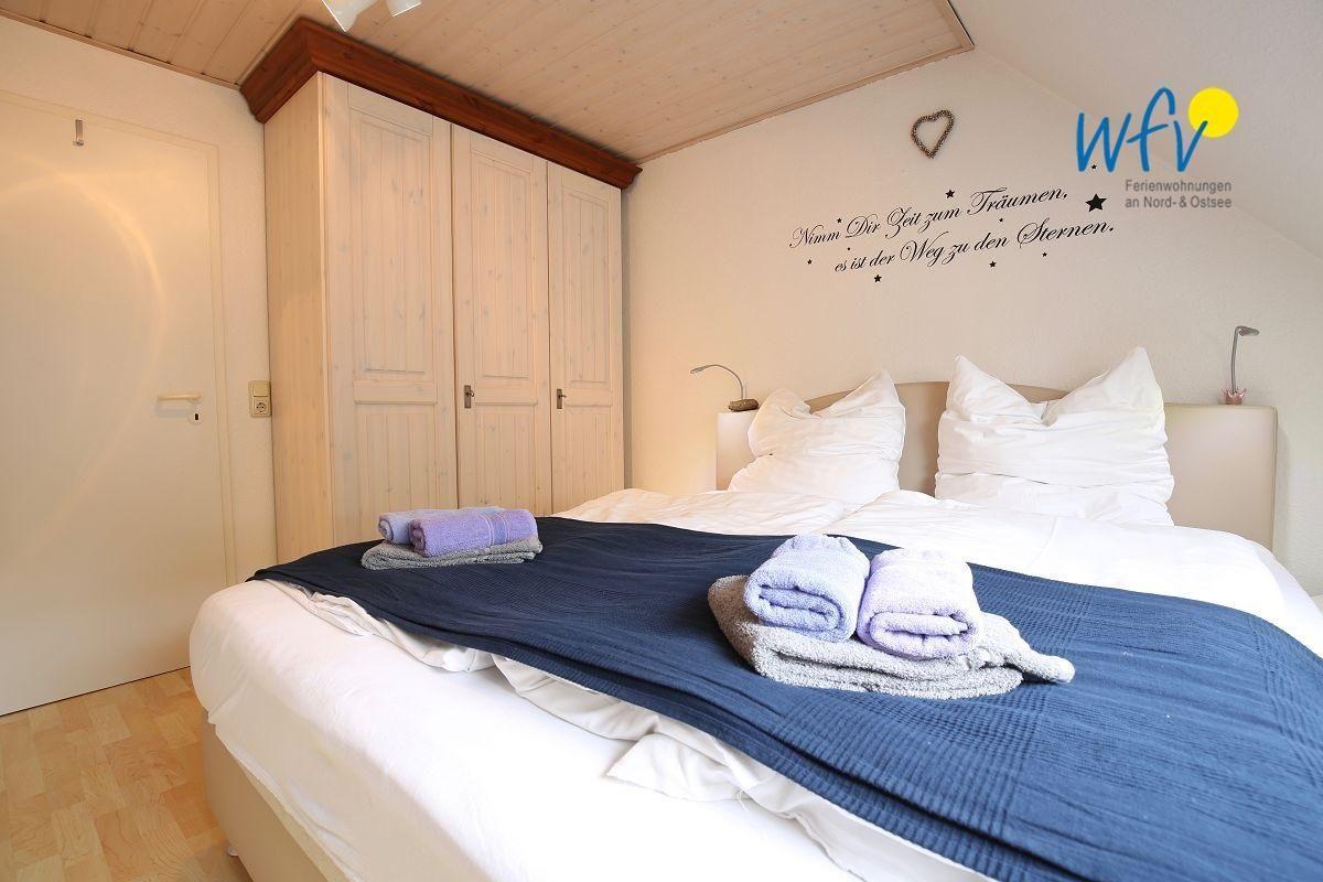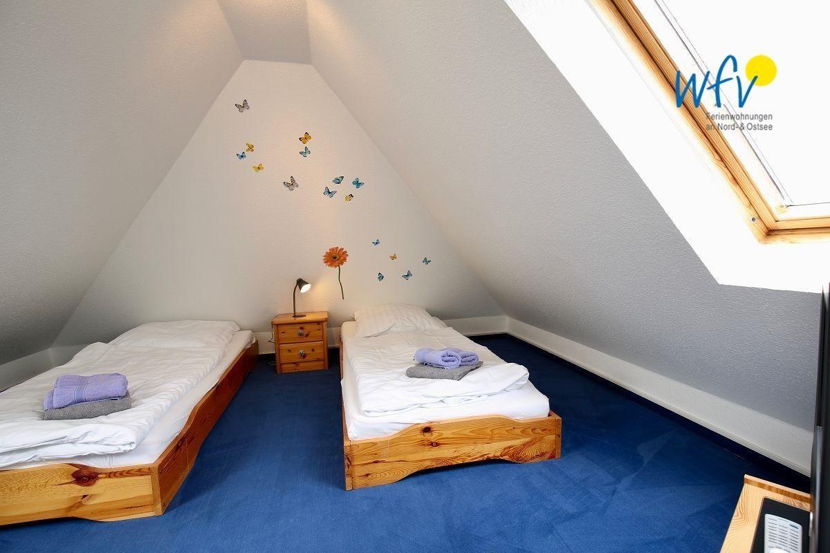 Das separate Schlafzimmer, das im Erdgeschoss liegt, verfügt über ein komfortables Doppelbett (Boxspring 1,80 x 2,00m). Im Dachgeschoss befindet sich das zweite separate Schlafzimmer. Es ist mit zwei (verschiebbaren) Einzelbetten ( 0,90 x 2,00m ) eingerichtet und wirkt durch die Dachschrägen sehr kuschelig.
