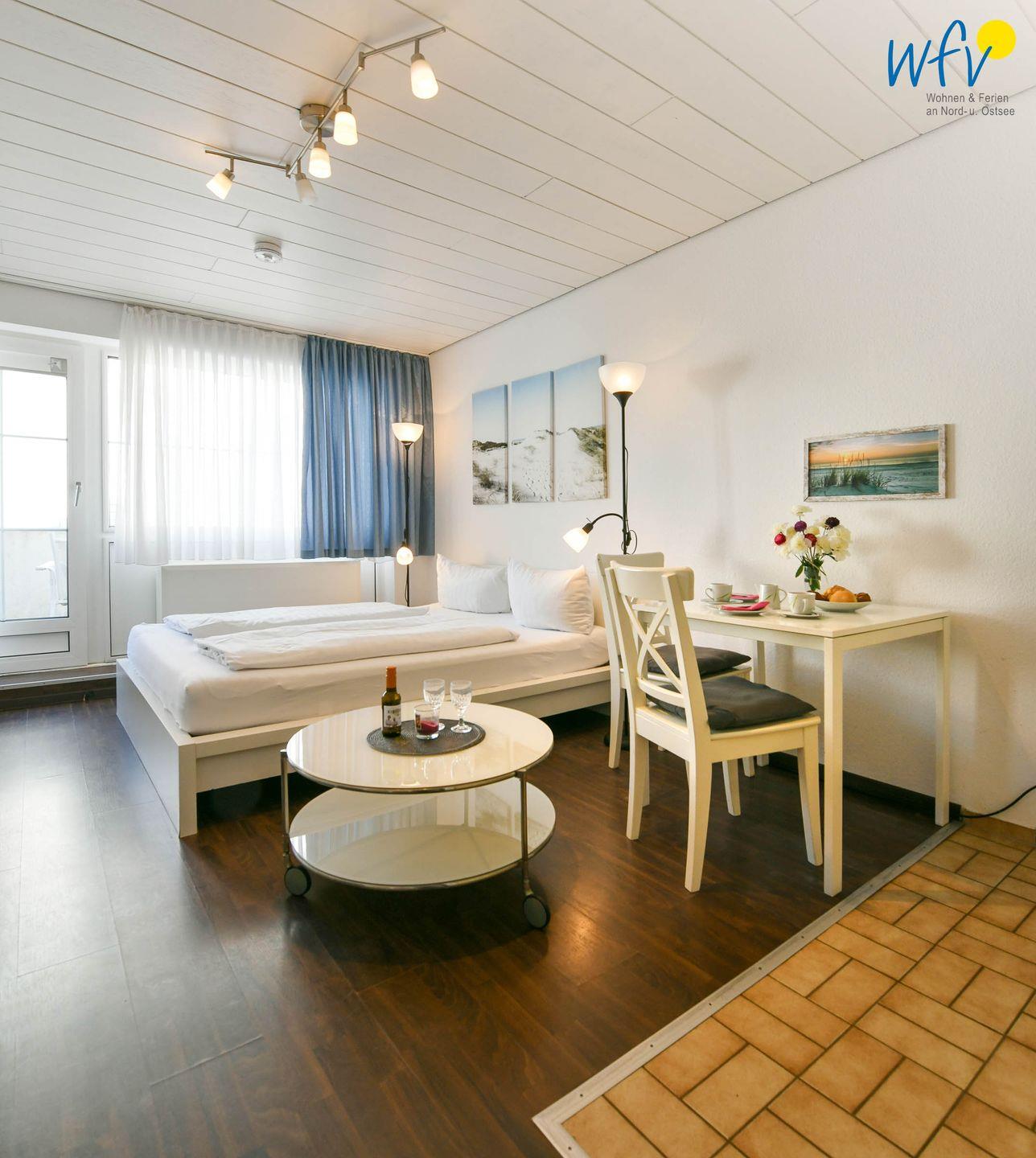 Machen Sie es sich in Ihrem Urlaub gemütlich! Vom ausgiebigen Ferienfrühstück am Esstisch, über bequeme Zeiten im Relaxsessel bis hin zum langen Ausschlafen in dem modernen Doppelbett (1,80 m x 2,00 m) - der große Wohnraum bietet Ihnen ein Rundum-Paket zum Wohlfühlen! Für den Snack zwischendurch oder das leckere Abendessen steht Ihnen eine Küchenzeile mit 2-Platten-Cerankochfeld, Geschirrspüler und Mikrowelle zur Verfügung.