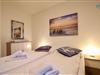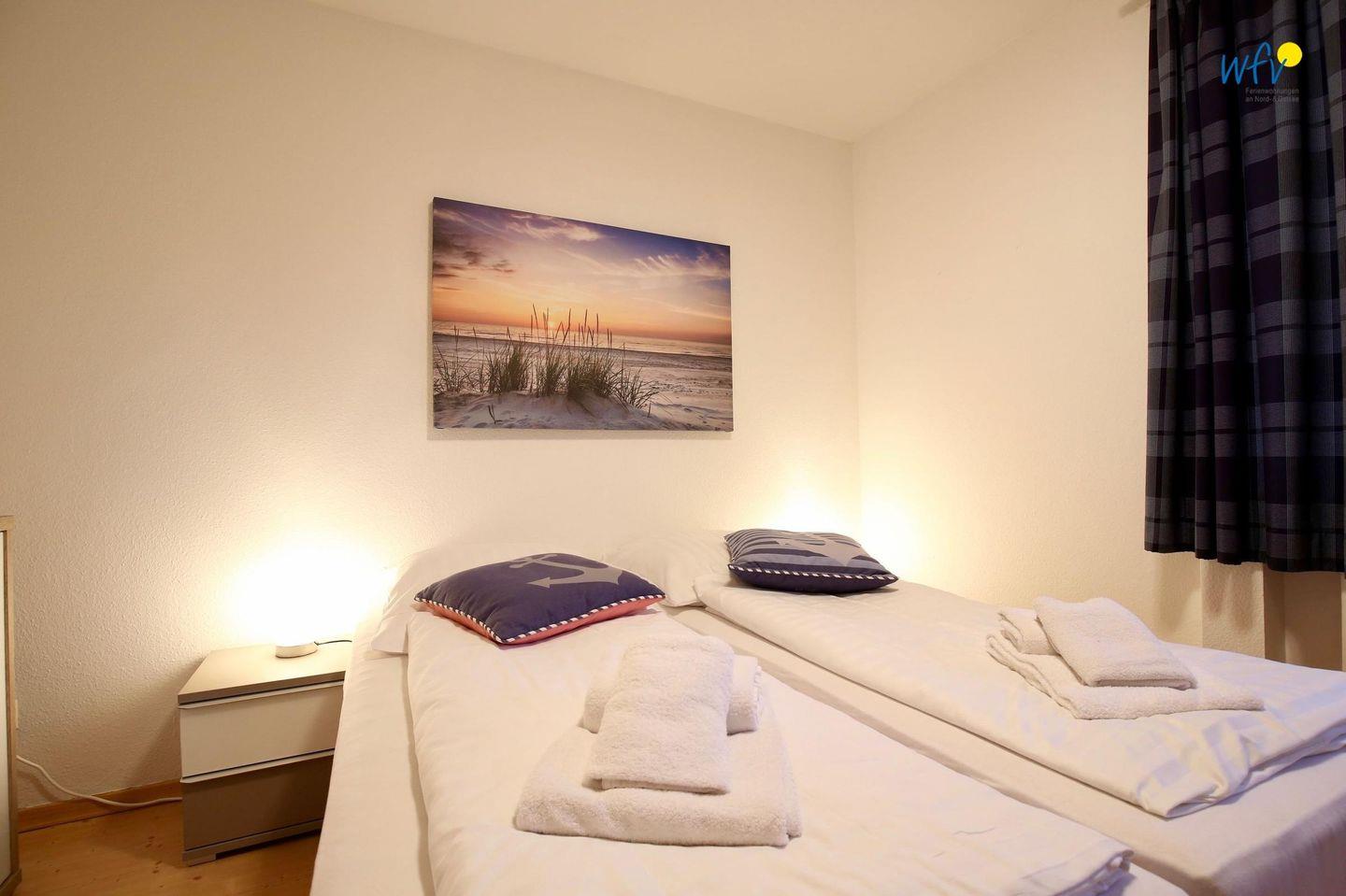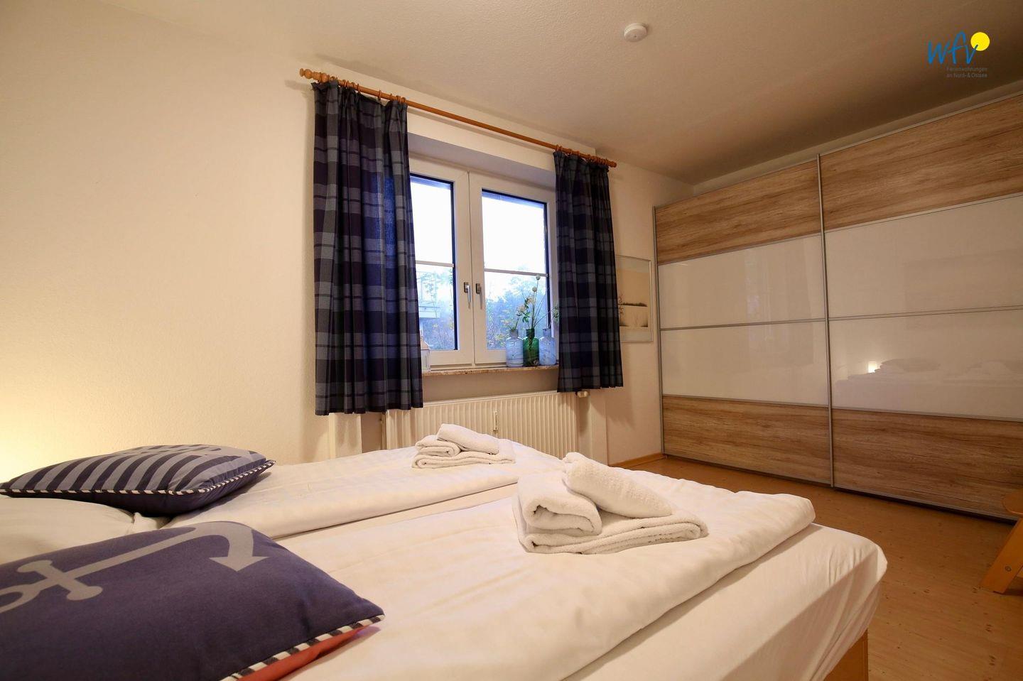 Das separate Schlafzimmer der Ferienwohnung auf Wangerooge ist mit feststehenden Betten ausgestattet. Weitere Schlafmöglichkeiten bestehen durch ein Schrankbett in dem gemütlichen Wohnraum.