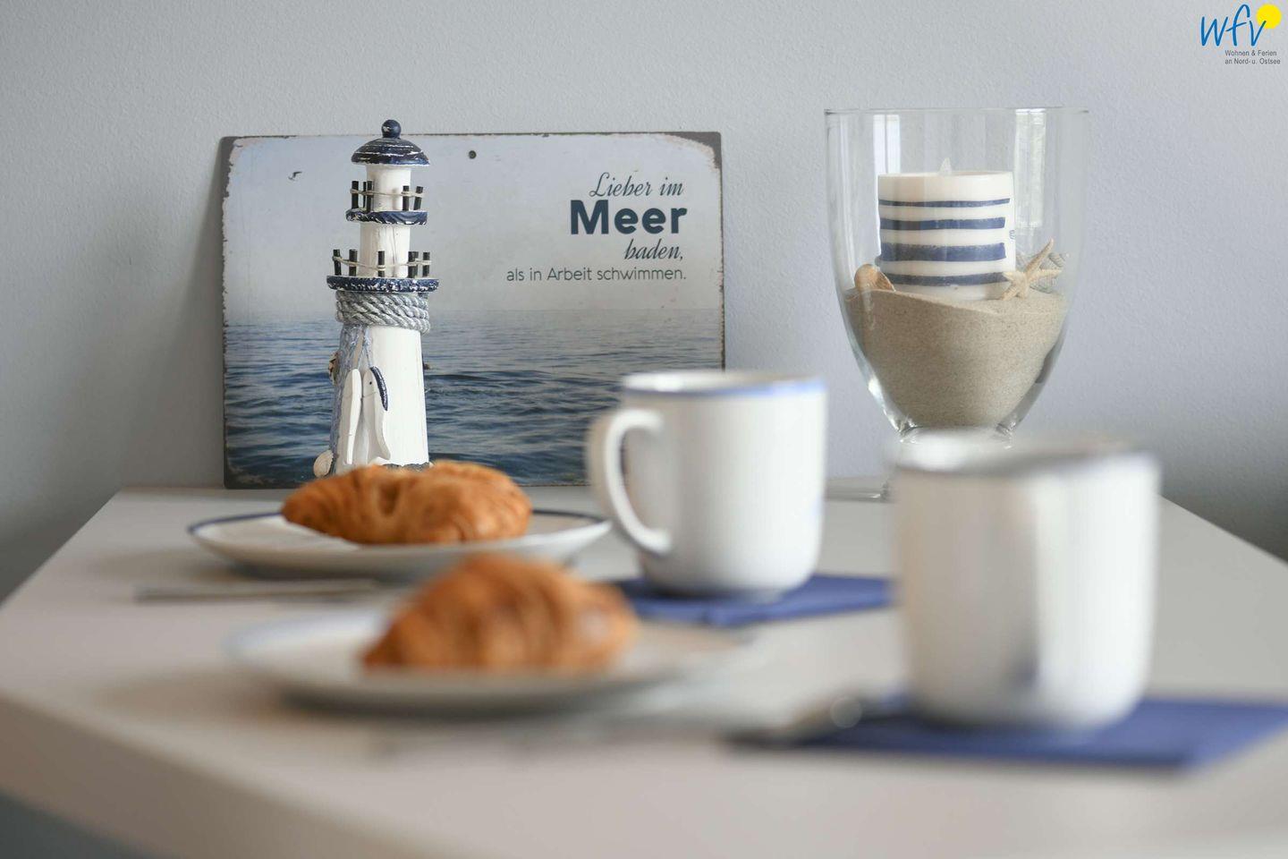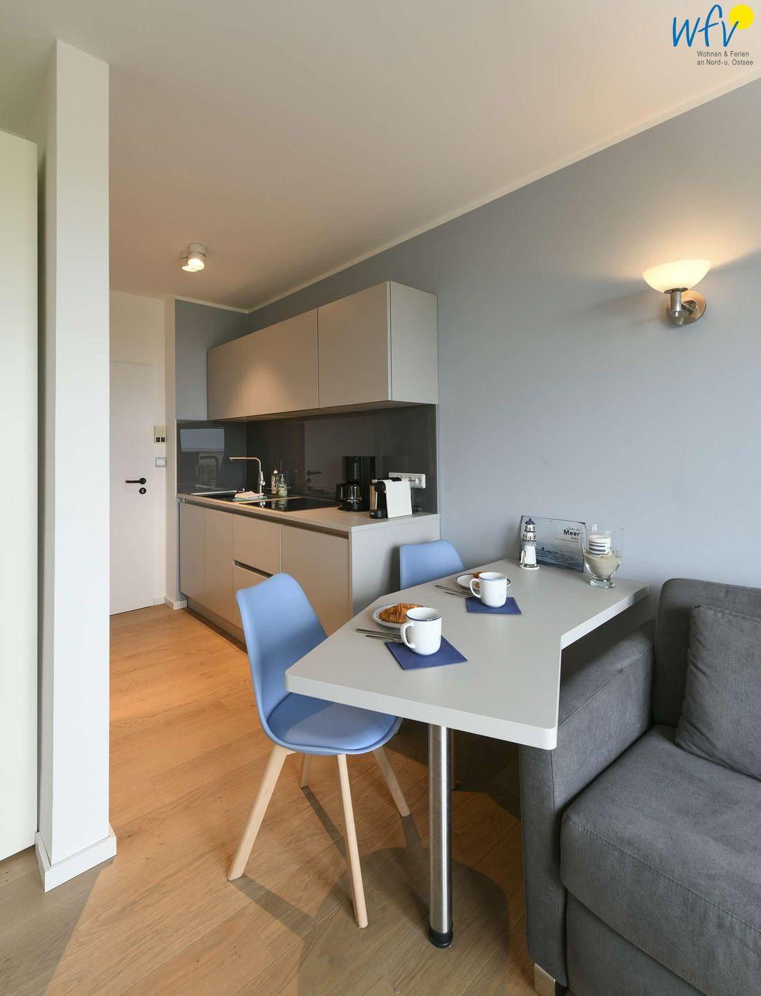 Die Ferienwohnung verfügt über einen Wohnraum mit integrierter Küche, Essplatz, Garderobe und Couchecke sowie über ein Duschbad. Während Sie bereits beim Frühstück am einladenden Esstisch mit Blick nach draußen Ihren Urlaubstag auf Wangerooge planen können, lädt die Couchecke mit Flat-TV und DVD-Player zum gemütlichen Relaxen am Abend ein.