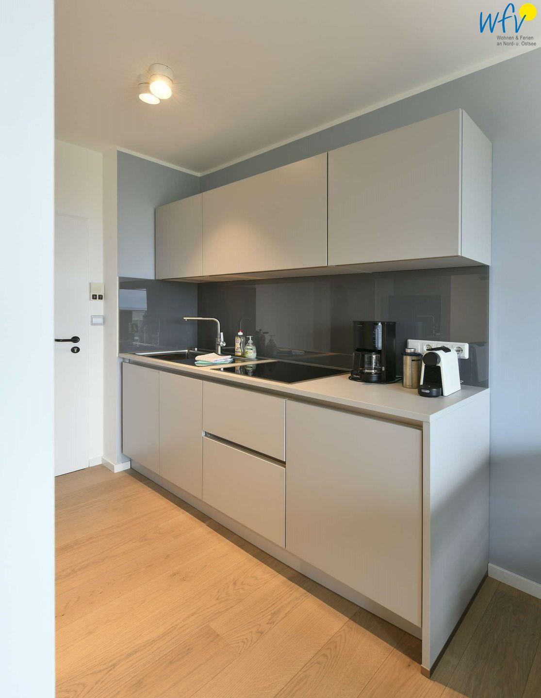 Eine moderne Küchenzeile garantiert Ihnen eine bequeme Selbstverpflegung in Ihrem Urlaub auf Wangerooge! Sie verfügt u.a. über einen Herd, einen Kühlschrank mit Gefrierfach und einen Geschirrspüler sowie über eine Kaffeemaschine, einen Wasserkocher, einen Toaster und einen Sandwich-Toaster.