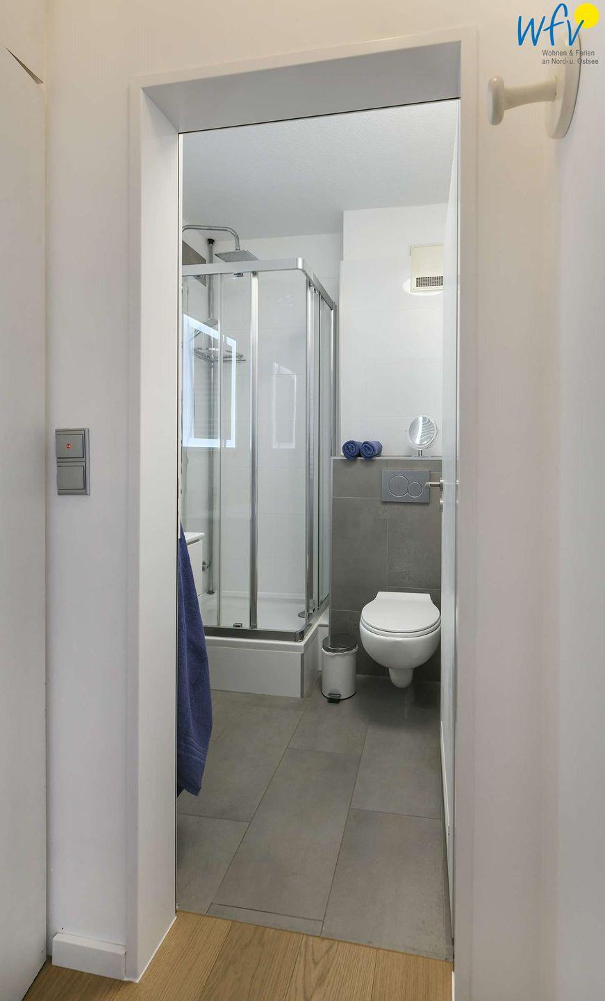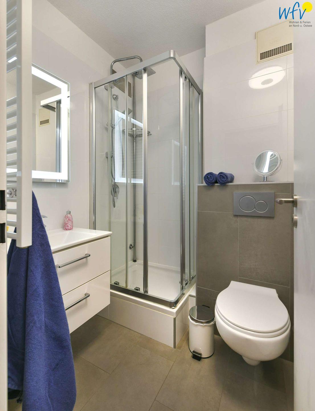 Weiteren Wohnkomfort bietet das gepflegte Duschbad in modernem Design - u.a. mit Duschwanne, Handtuchheizung und stilvollem Waschtisch. Ein Kosmetikspiegel und ein Fön gehören zum festen Inventar.
