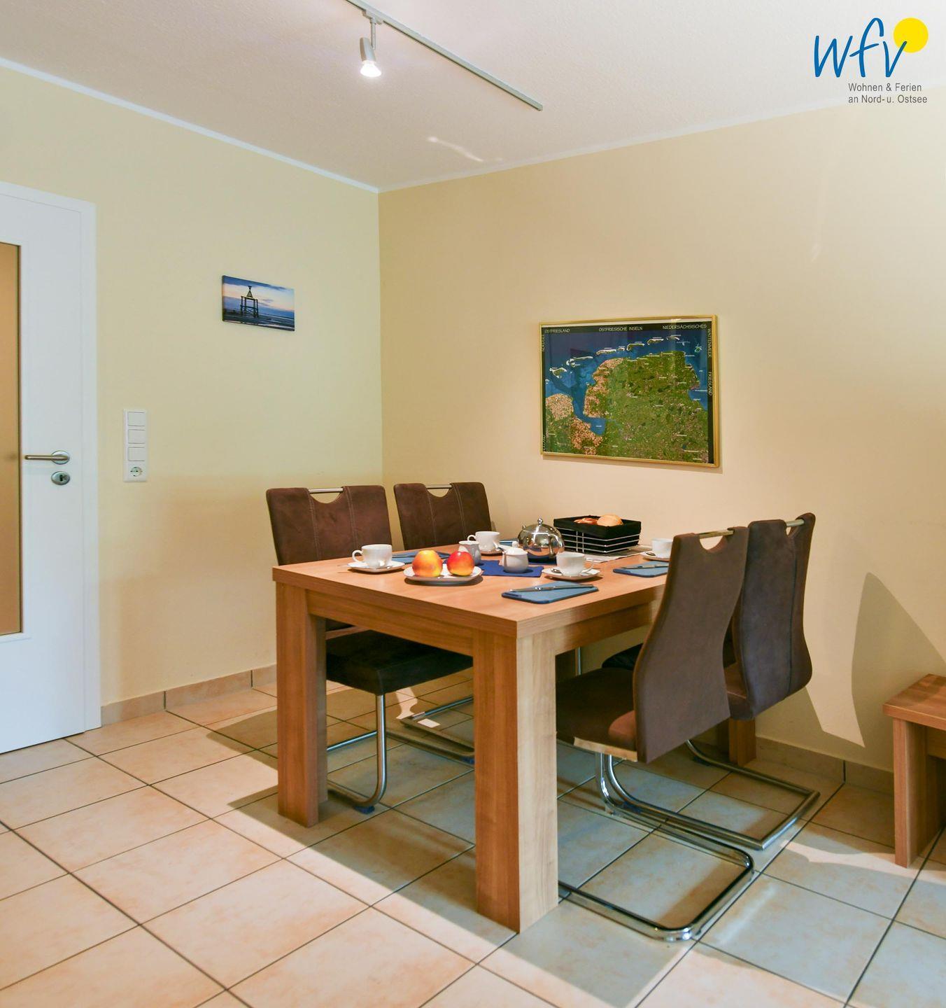 Die helle und freundliche Atmosphäre lädt auf Anhieb zum Entspannen und Wohlfühlen ein. Im Wohnraum empfängt Sie eine einladende Einrichtung in harmonischen Farben, maritime Accessoires sorgen für schönes Flair und das entsprechende Nordseegefühl. Am Esstisch lassen sich beim ausgiebigen Ferienfrühstück Pläne für den Urlaubstag machen. Und während einer von Ihnen den Rucksack für den Ausflug packt, kann in der offenen Küche mit Ceranherd, Backofen, Kaffeemaschine etc. der leckere Proviant für unterwegs zubereitet werden.