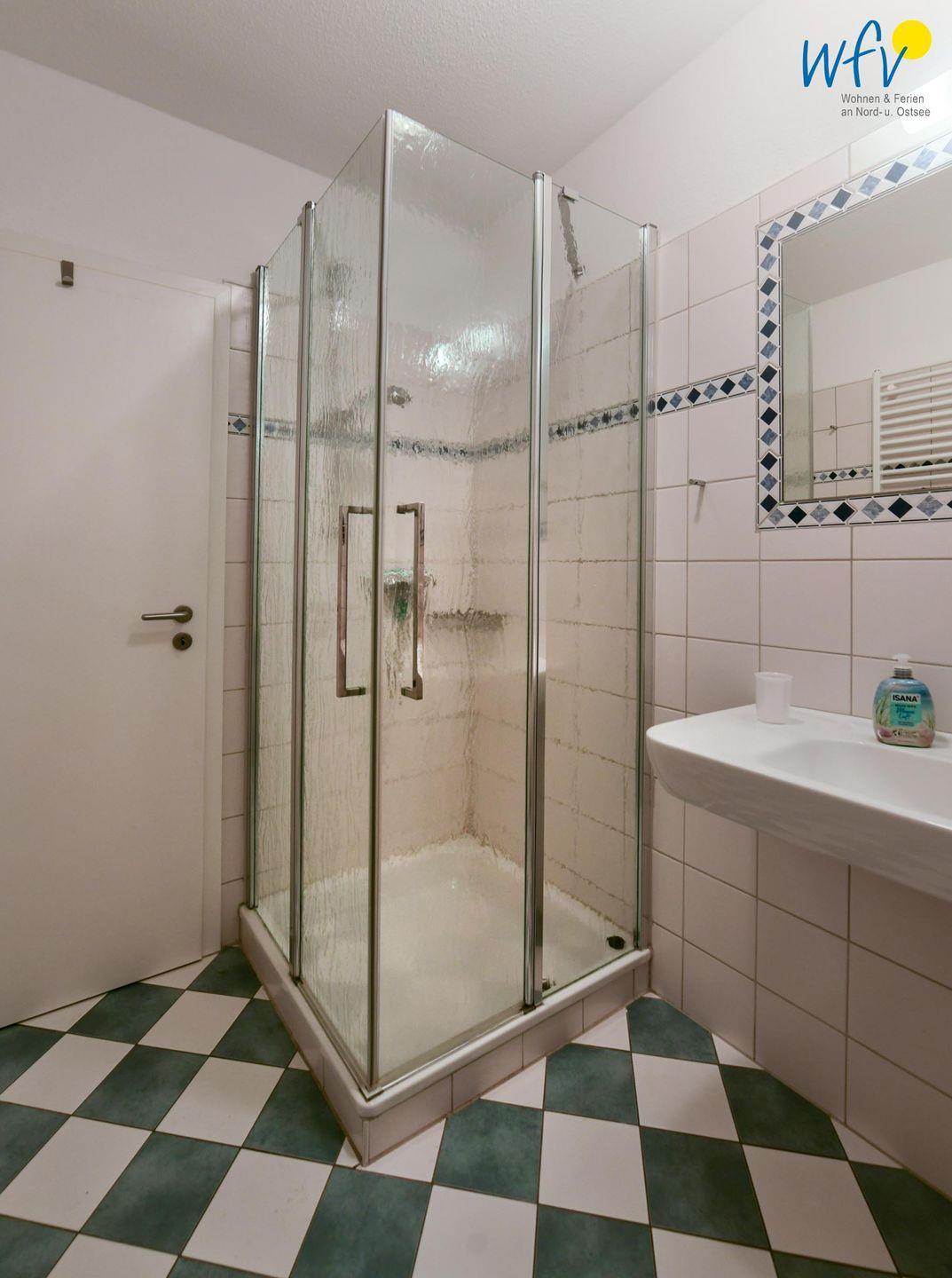 Das gepflegte Badezimmer mit Dusche, breitem Spiegel, Haartrockner und Handtuchheizung sorgt für weiteren Wohnkomfort.