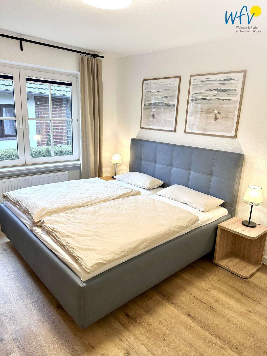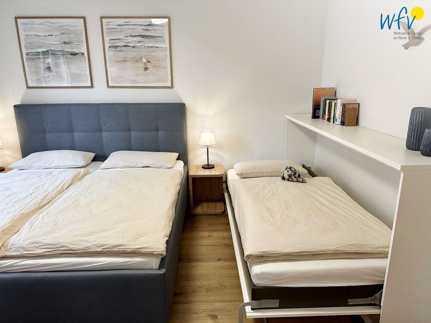 Wenn auf Wangerooge die Bordsteine hochgeklappt werden, wartet auf Sie ein gemütliches separates Schlafzimmer mit Doppelbett. Hier befindet sich zusätzlich ein Einzelbett für eine weitere Person.