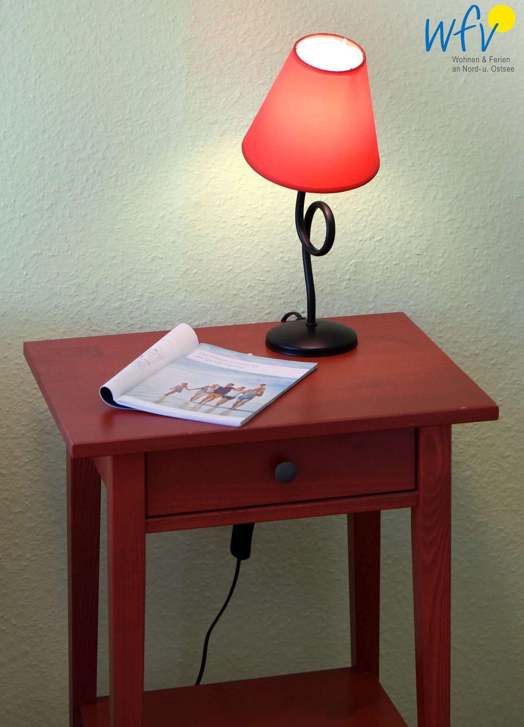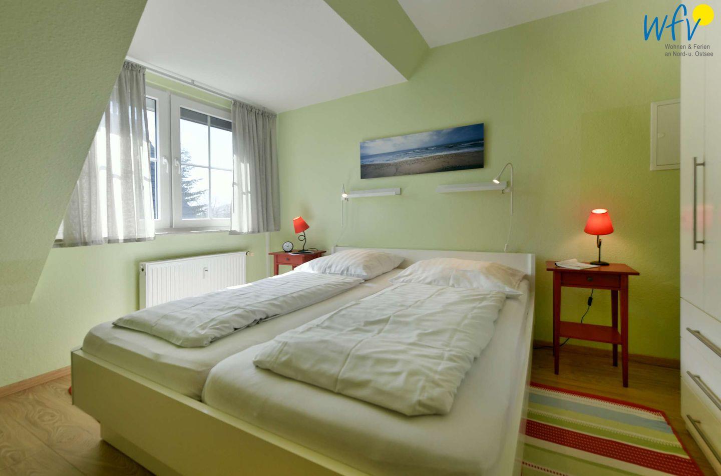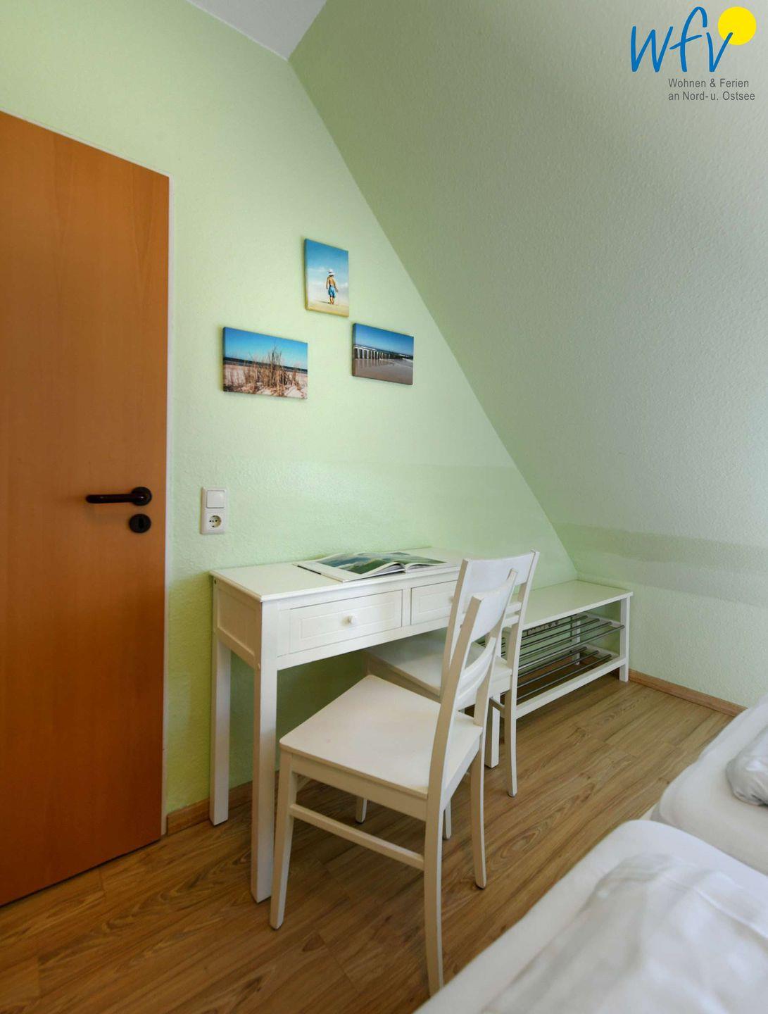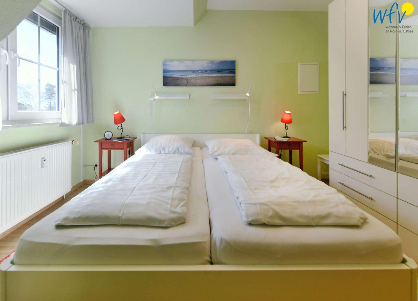 Das separate Schlafzimmer der Ferienwohnung ist mit einem Doppelbett (2 x 90 cm x 2 m), einem großen Kleiderschrank mit gut durchdachtem Stauraum und einer kleinen Schreibkommode ausgestattet. Eine zusätzliche Schlafmöglichkeit besteht durch ein hochwertiges 1,60 m breites Schlafsofa (aus hygienischen Gründen entspricht die Sitzfläche nicht der Schlaffläche).