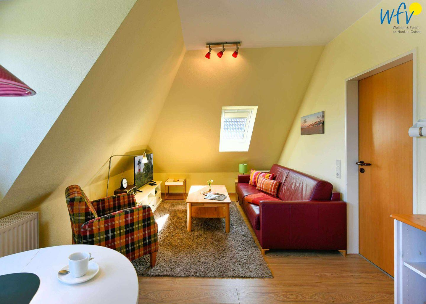 Herrlich ausspannen können Sie vor allem im Wohnraum der Ferienwohnung, der mit einer Sitzecke und TV ausgestattet ist. Der schöne Essbereich am Fenster lädt dazu ein, bereits beim Ferienfrühstück einen entspannten Urlaubstag in der Natur zu planen.