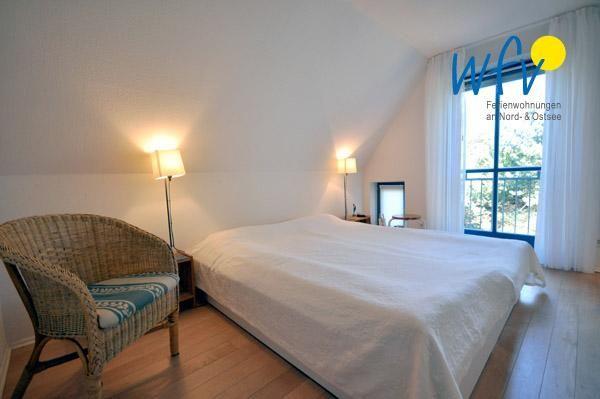 Im Obergeschoss des "Ferienhaus Friesenblick" befinden sich drei Schlafzimmer; im Dachgeschoss liegt das vierte Schlafzimmer. Zwei der Räume verfügen über ein Doppelbett, die beiden anderen Schlafzimmer sind jeweils mit zwei Einzelbetten eingerichtet.