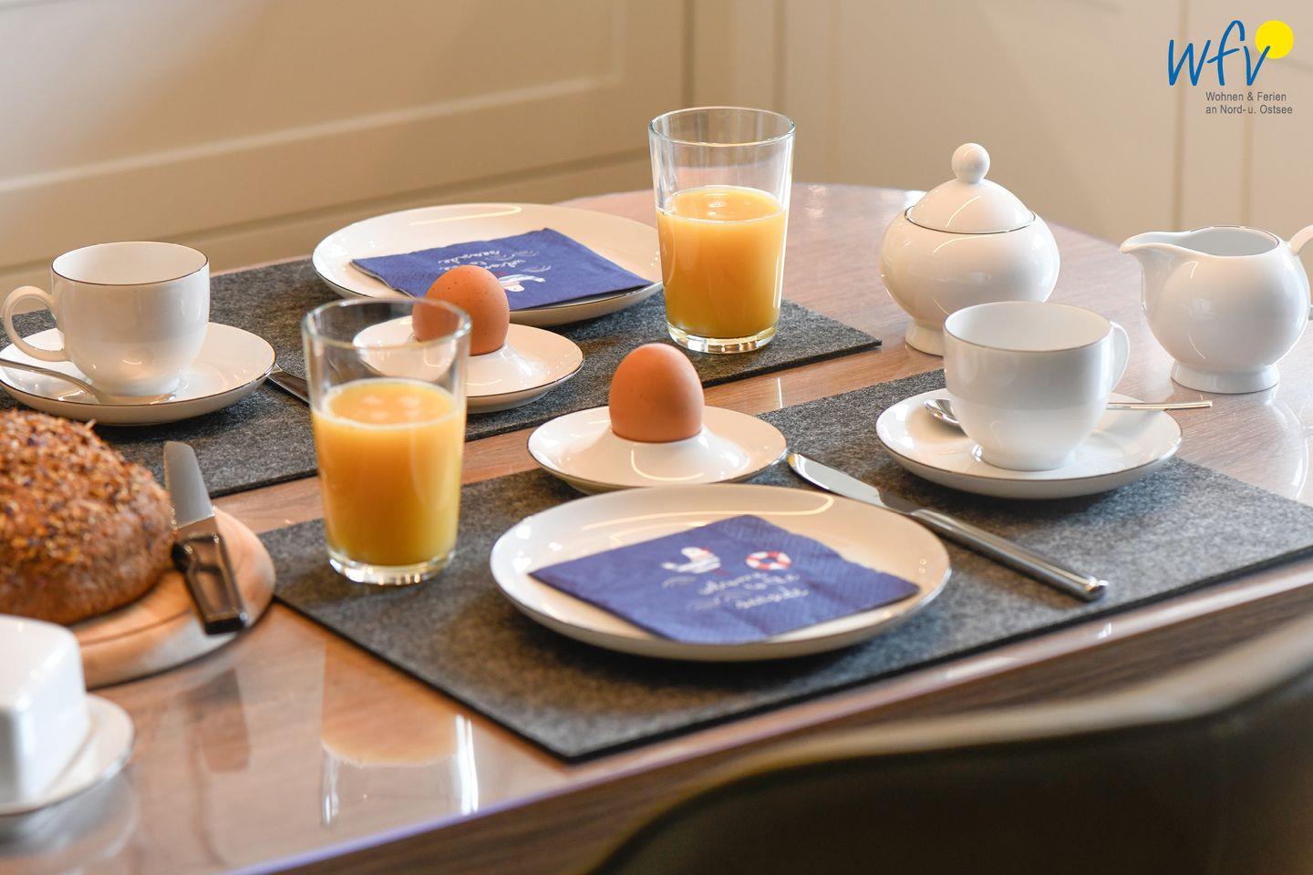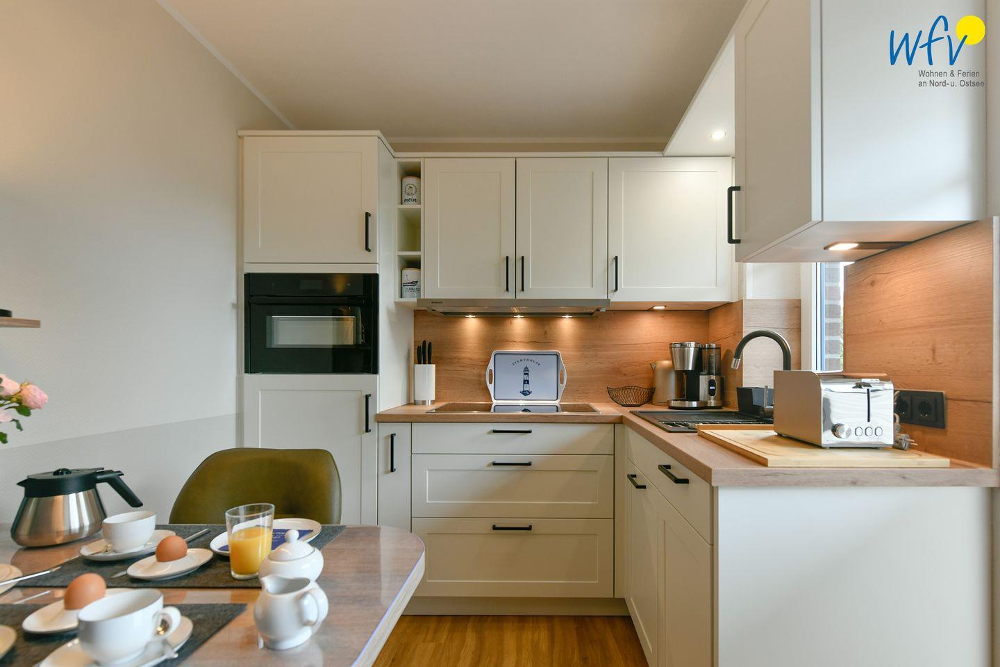 Für die bequeme Selbstverpflegung in Ihrem Urlaub auf Wangerooge verfügt die Ferienwohnung über eine hochwertig moderne Einbauküche - u.a. mit Induktionsherd/Backofen mit integrierter Mikrowelle, Kühlschrank mit Gefrierfach, Geschirrspüler sowie Kaffeemaschine, Wasserkocher und Toaster. Ein kleiner Essplatz mit schönem Blick auf die sonnige Südterrasse mit Garten (Doppelflügeltüre) gehört ebenfalls zur Einrichtung.