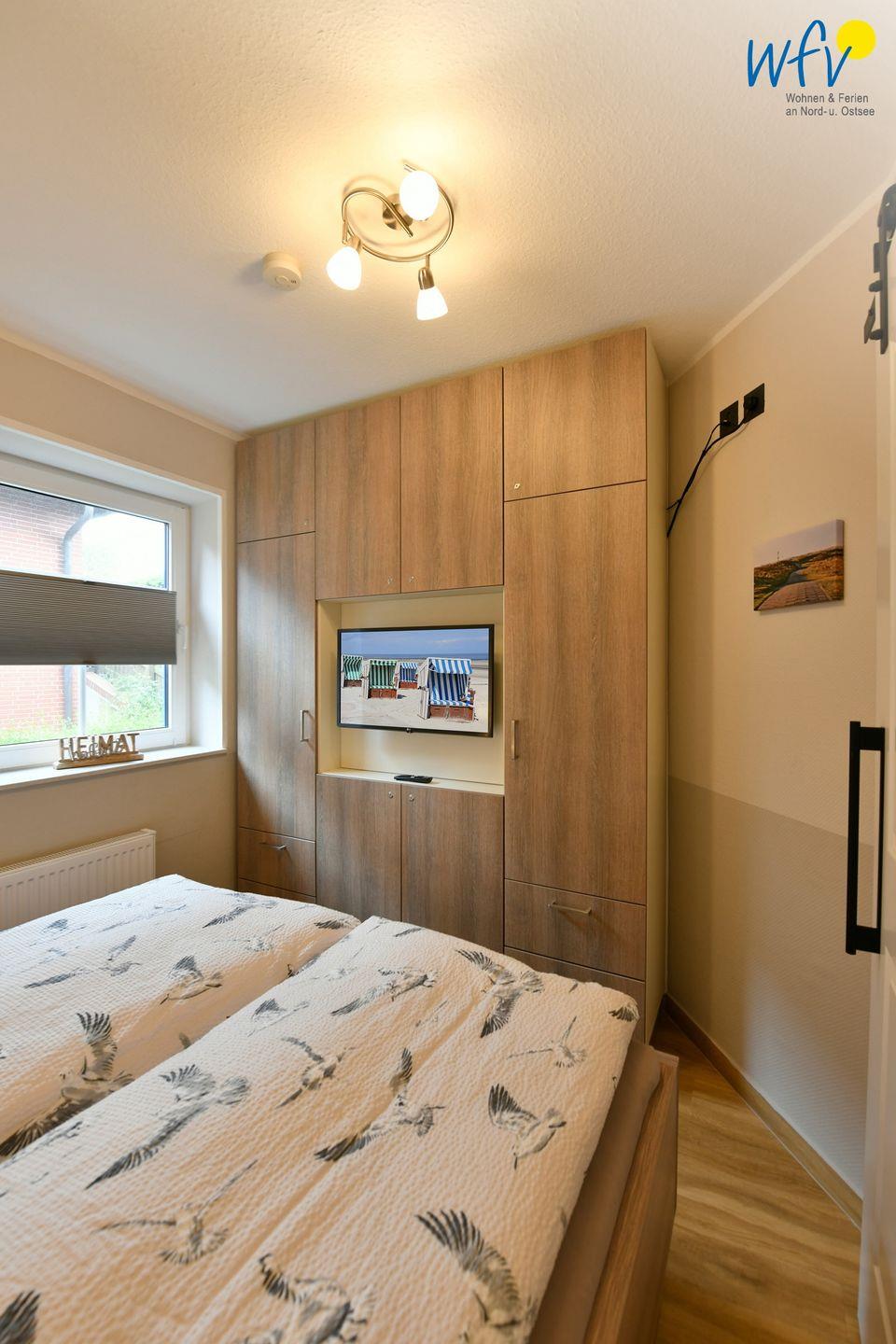 Herrlich lange ausschlafen können Sie in den bequemen Betten unserer ****Ferienwohnung! In dem separaten Schlafzimmer mit Verdunkelungsmöglichkeit befindet sich ein komfortables Doppelbett (160 x 200 cm/ 4-Jahreszeiten-Bettdecken) sowie ein zweiter Flachbildfernseher für gemütliches Fernsehen vom Bett aus. Ein geräumiger Kleiderschrank bietet Platz für Ihre Urlaubsgarderobe.