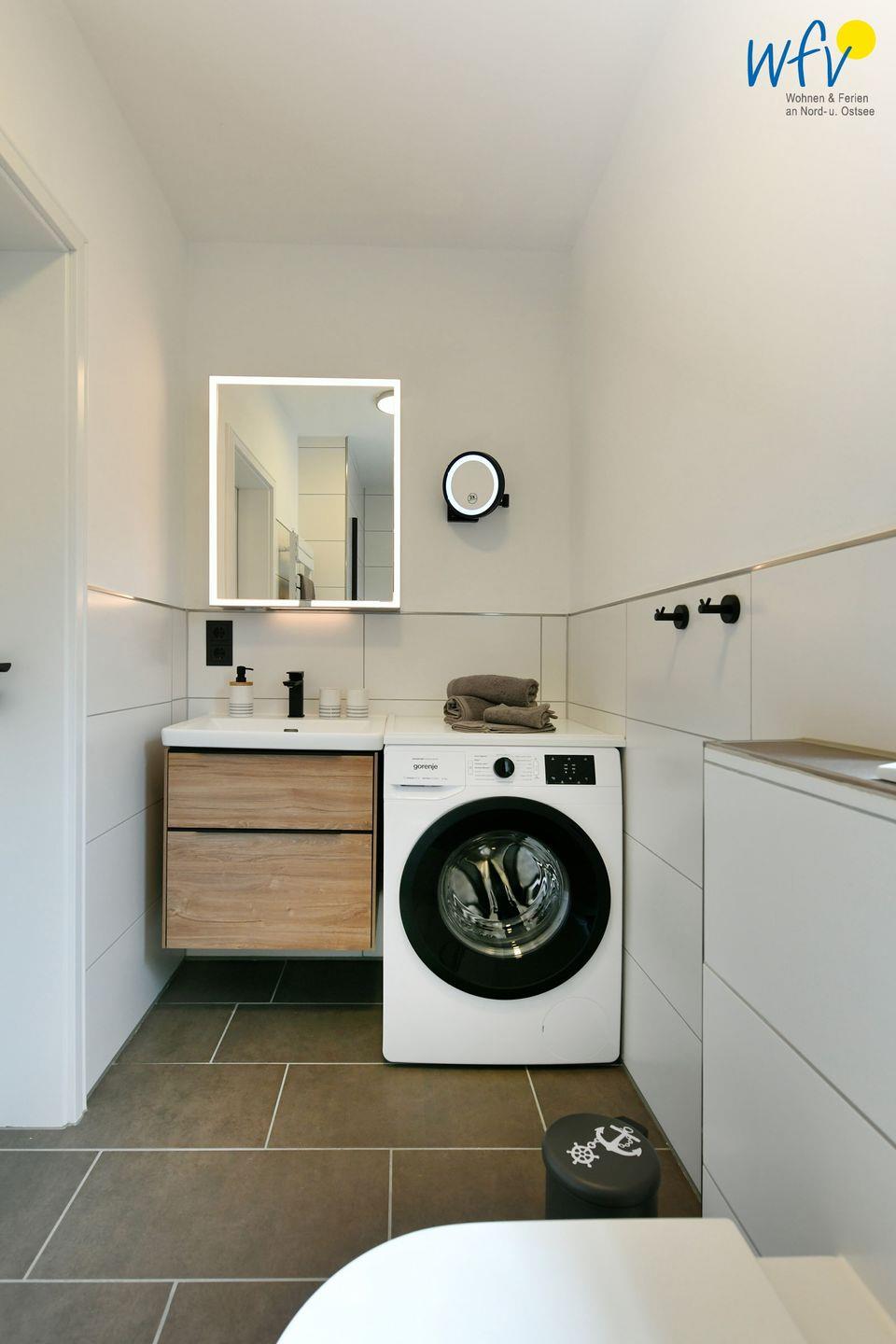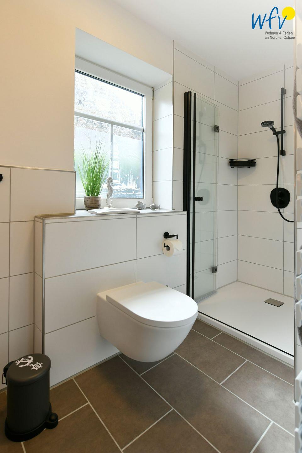 Modernen Wohnkomfort bietet Ihnen auch das Tageslichtbad in stilvollem Design mit Waschtisch, WC, Handtuchheizung und bodengleicher Glasdusche. Ein Föhn gehört zum festen Inventar.