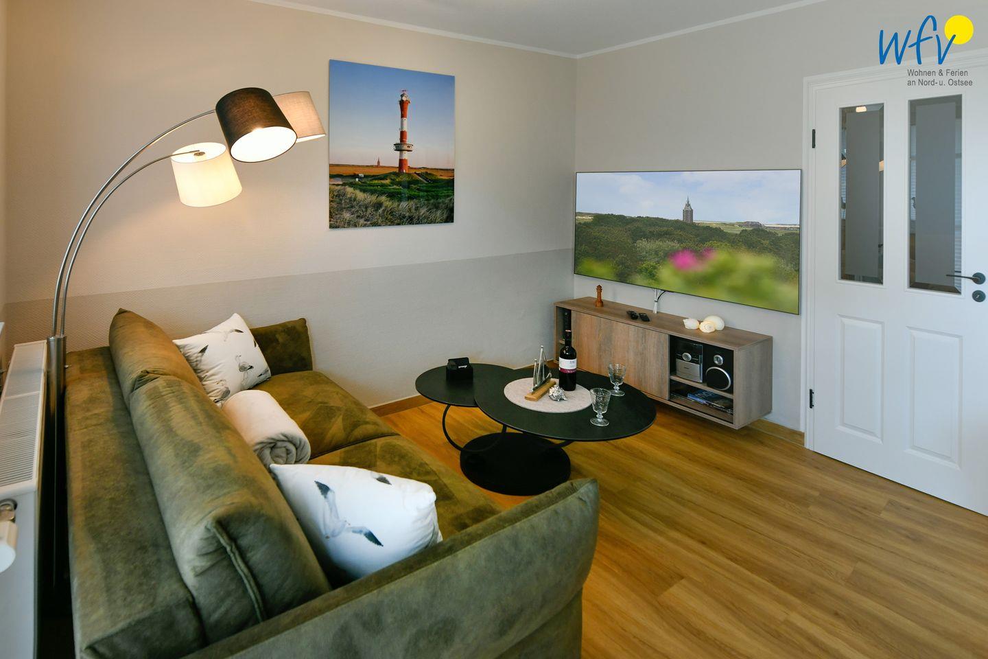 Nach dem Strandtag oder der Fahrradtour lädt die gemütliche Couchecke mit Relaxsessel und OLED-Flachbildfernseher zum ausgiebigen Entspannen ein - ein wunderbarer Platz zum Fernsehen, Musik hören und Ausruhen. Sie genießen das Streaming-Angebot "WoW Sky Blockbuster" inkl. Live Sport, Netflix und Amazon prime Video. Zum Surfen vom Smartphone aus empfangen Sie freies WLAN ohne weitere Kosten.