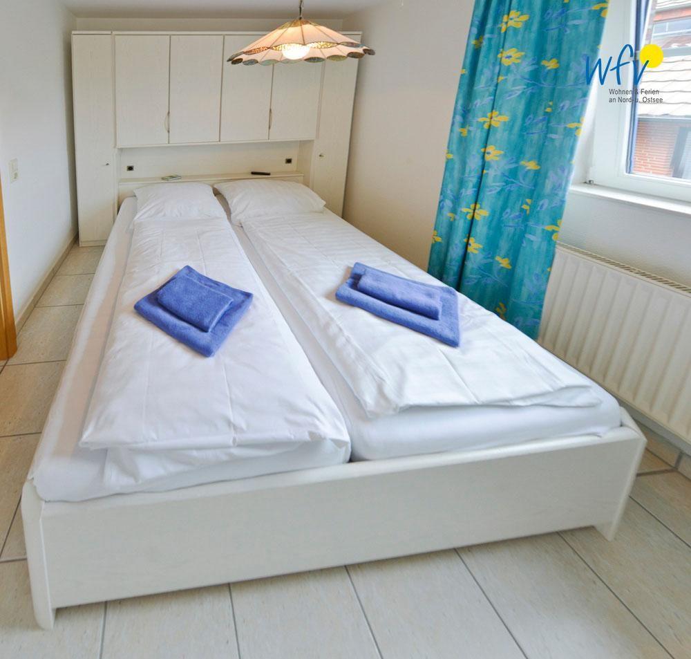 In dem separaten Schlafzimmer befindet sich ein Doppelbett. Eine dritte Person findet auf der Schlafcouch im Wohnzimmer Platz.
