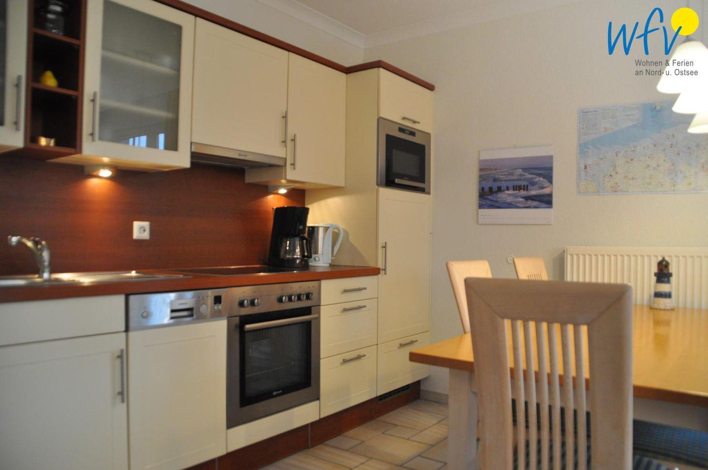 Für eine bequeme Selbstverpflegung in Ihrem Urlaub auf Wangerooge ist die Küche komplett ausgestattet - u.a. mit einem großen Kühlschrank, einem 4-Platten-Ceranherd mit Backofen, einer Mikrowelle, einer Spülmaschine und diversen Kleingeräten.