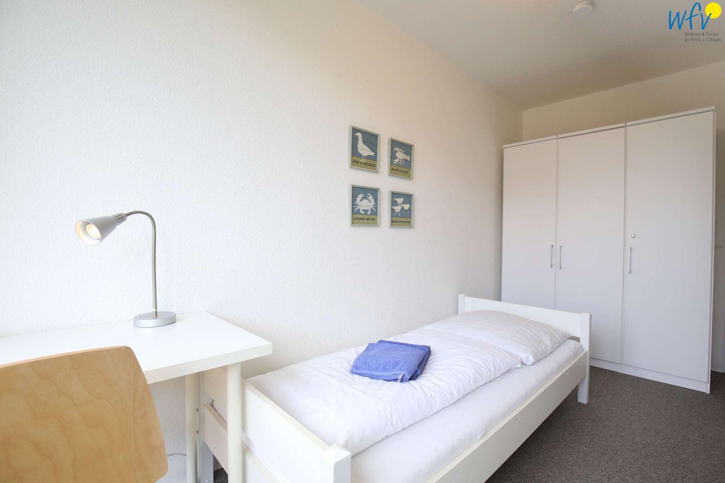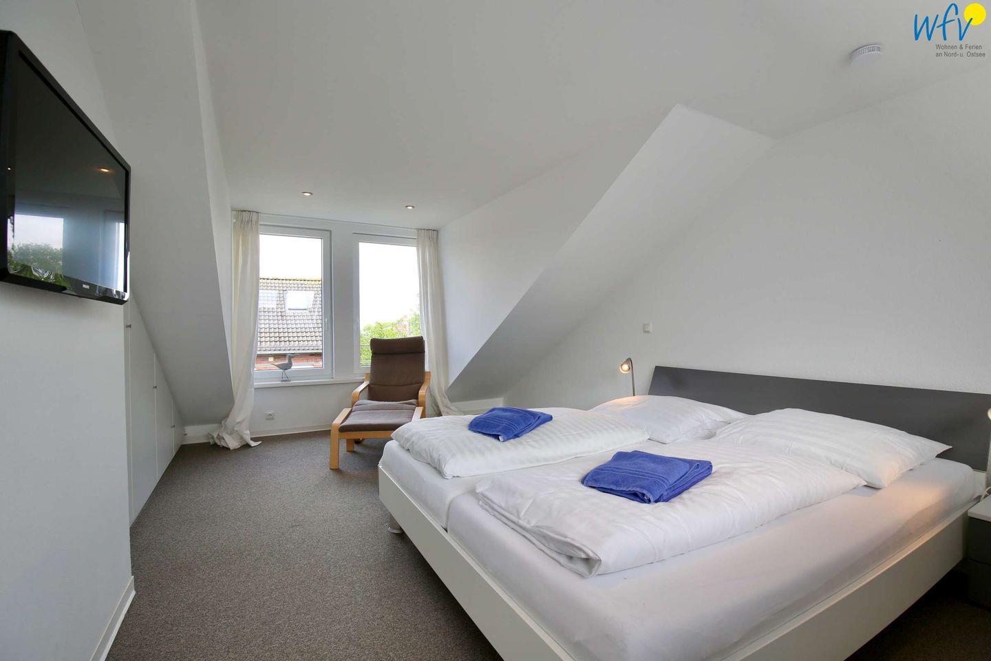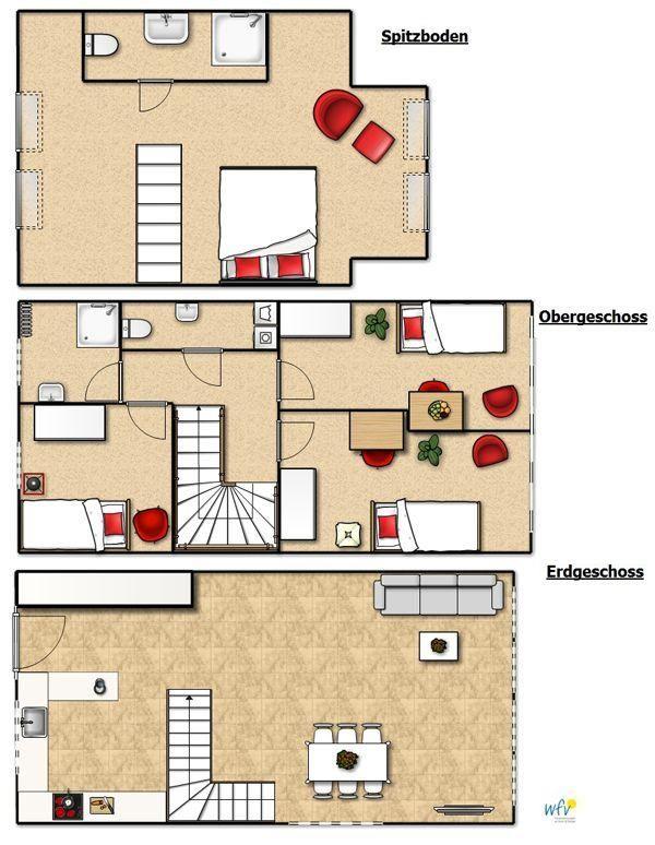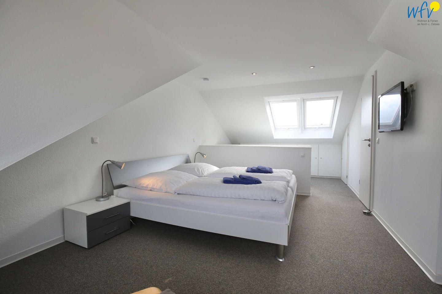 Drei der separaten Schlafzimmer sind jeweils mit einem Einzelbett eingerichtet, das vierte Schlafzimmer im Spitzboden mit einem Doppelbett. Für angenehme Aufteilungsmöglichkeiten verfügt sowohl das OG, als auch das DG über ein Badezimmer mit Dusche (im Obergeschoss sind Dusche und WC sogar voneinander getrennt).