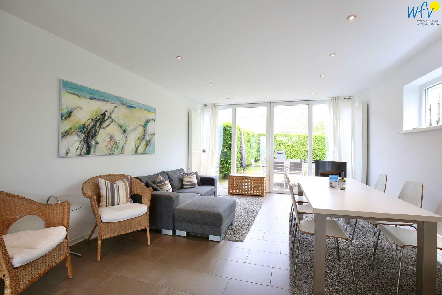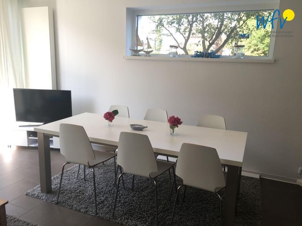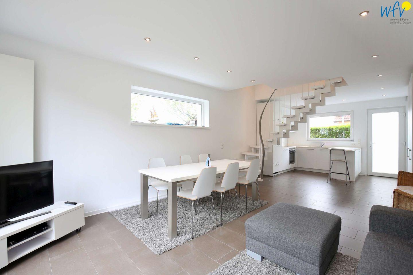 Der hochwertig eingerichtete Wohnraum lädt zu entspannten Stunden ein - zum Fernsehen oder Musik hören. Zum Surfen vom Smartphone aus empfangen Sie freies WLAN. Der große Esstisch ist perfekt für gemeinsame Mahlzeiten, zum Klönen bei einem guten Glas Wein oder für lustige Spieleabende.