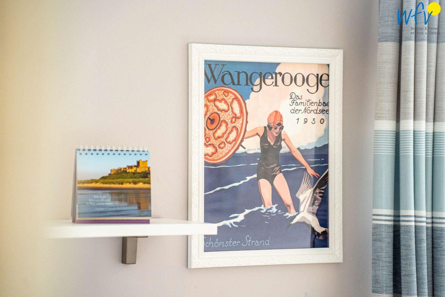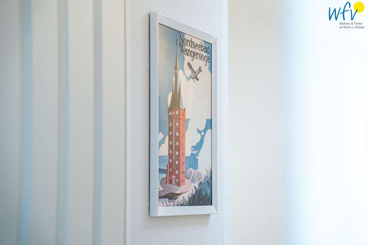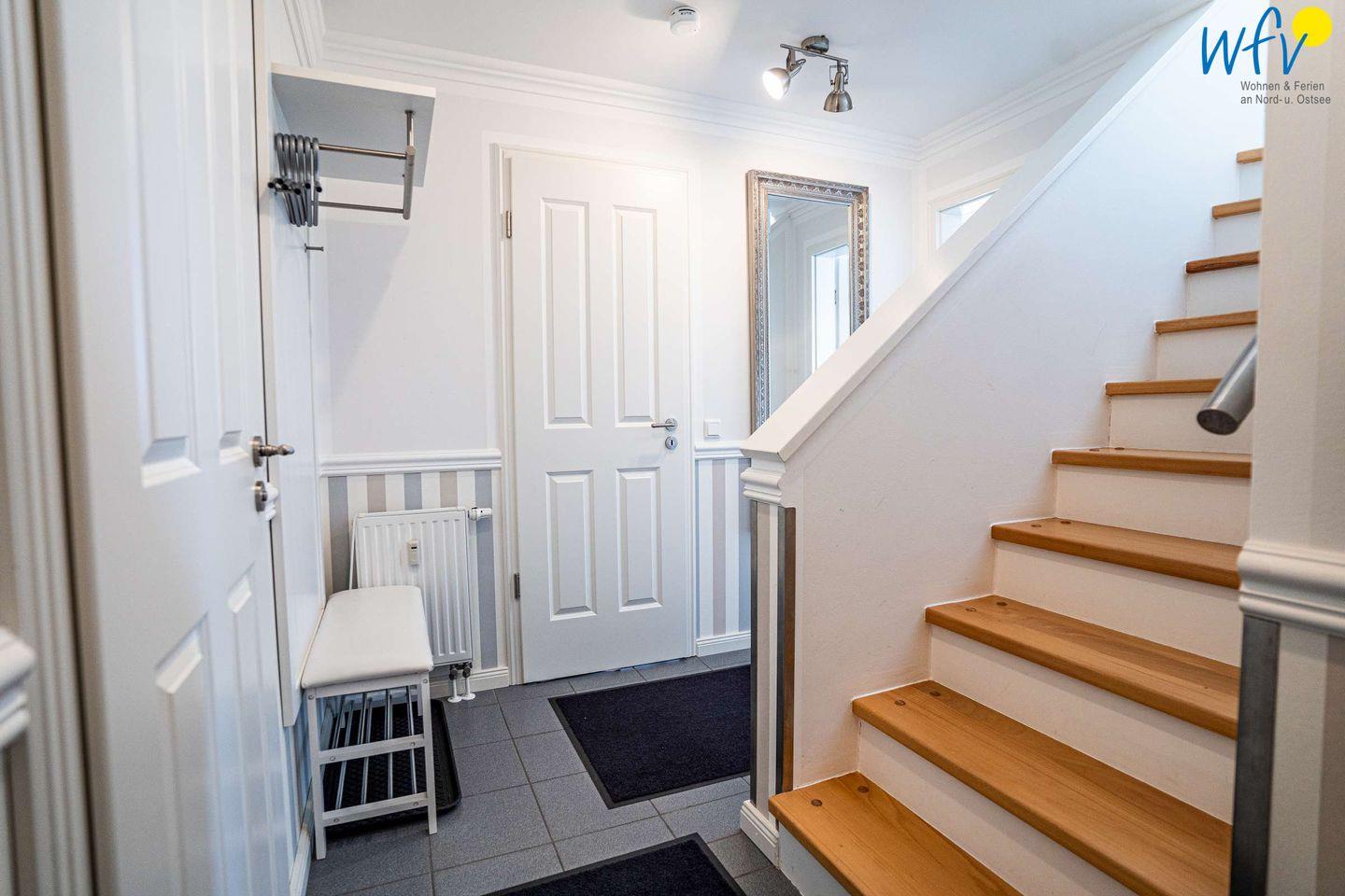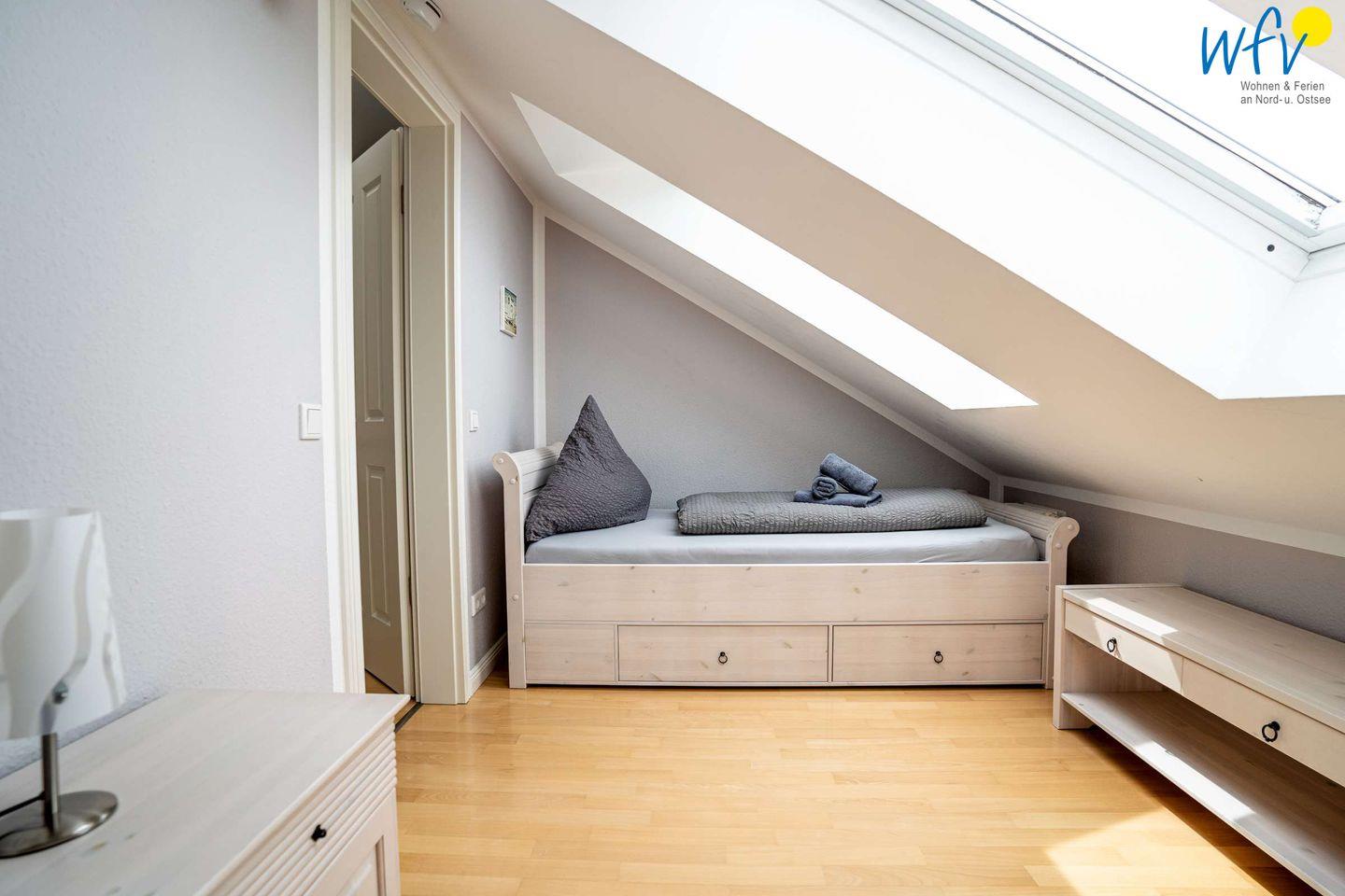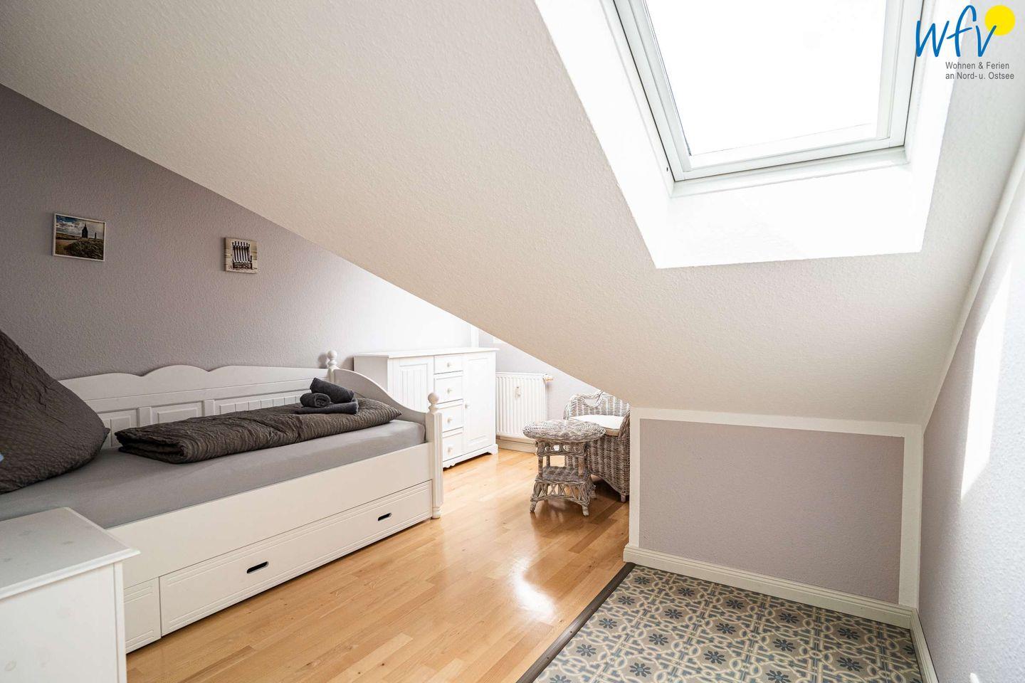 Die Ferienwohnung erstreckt sich über das 3. und 4. OG des Hauses. Helle Räume in harmonischen Farben mit maritimem Flair sorgen für eine sehr freundliche Atmosphäre und das entsprechende Nordseegefühl. In der ersten Etage der Ferienwohnung befinden sich ein geräumiger Wohn-Essbereich, ein separates Schlafzimmer, eine Küche und ein Bad. Im Dachgeschoss liegen drei weitere separate Schlafzimmer sowie ein zusätzliches Bad. Zwei der Schlafzimmer sind mit einem Doppelbett ausgestattet, die anderen beiden mit zwei Einzelbetten bzw. einem Einzelbett. Für unsere kleinsten Gäste ist ein Kinderbett vorhanden.