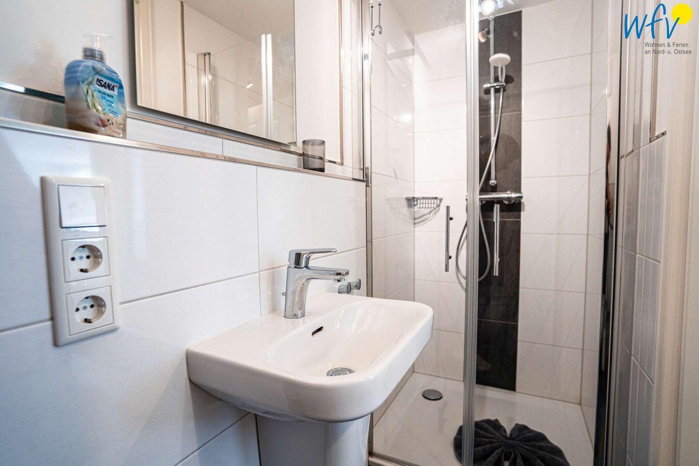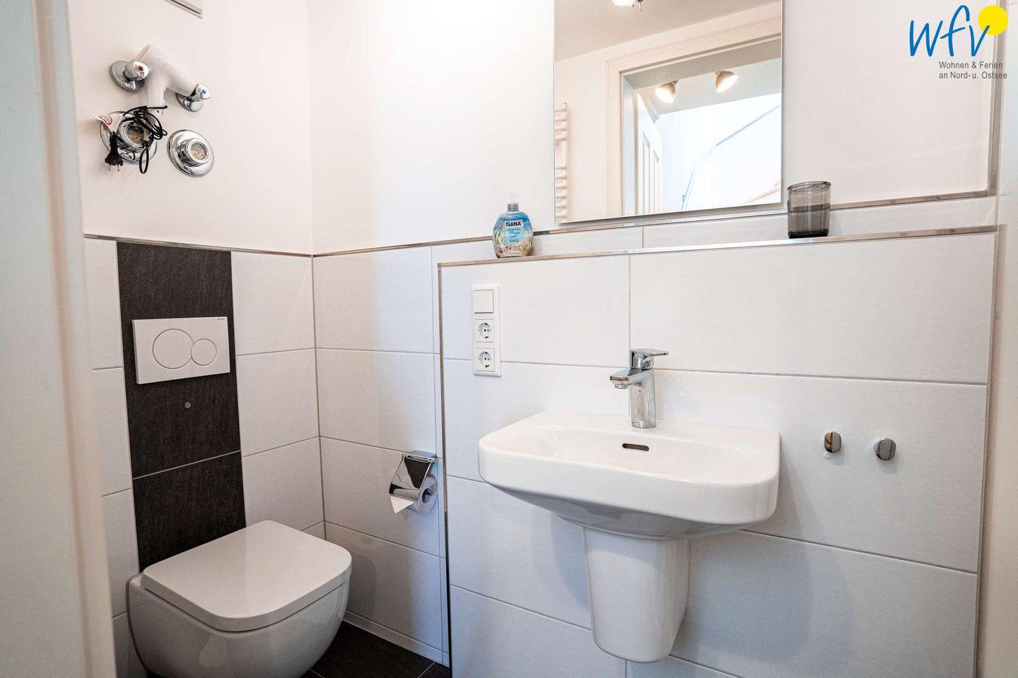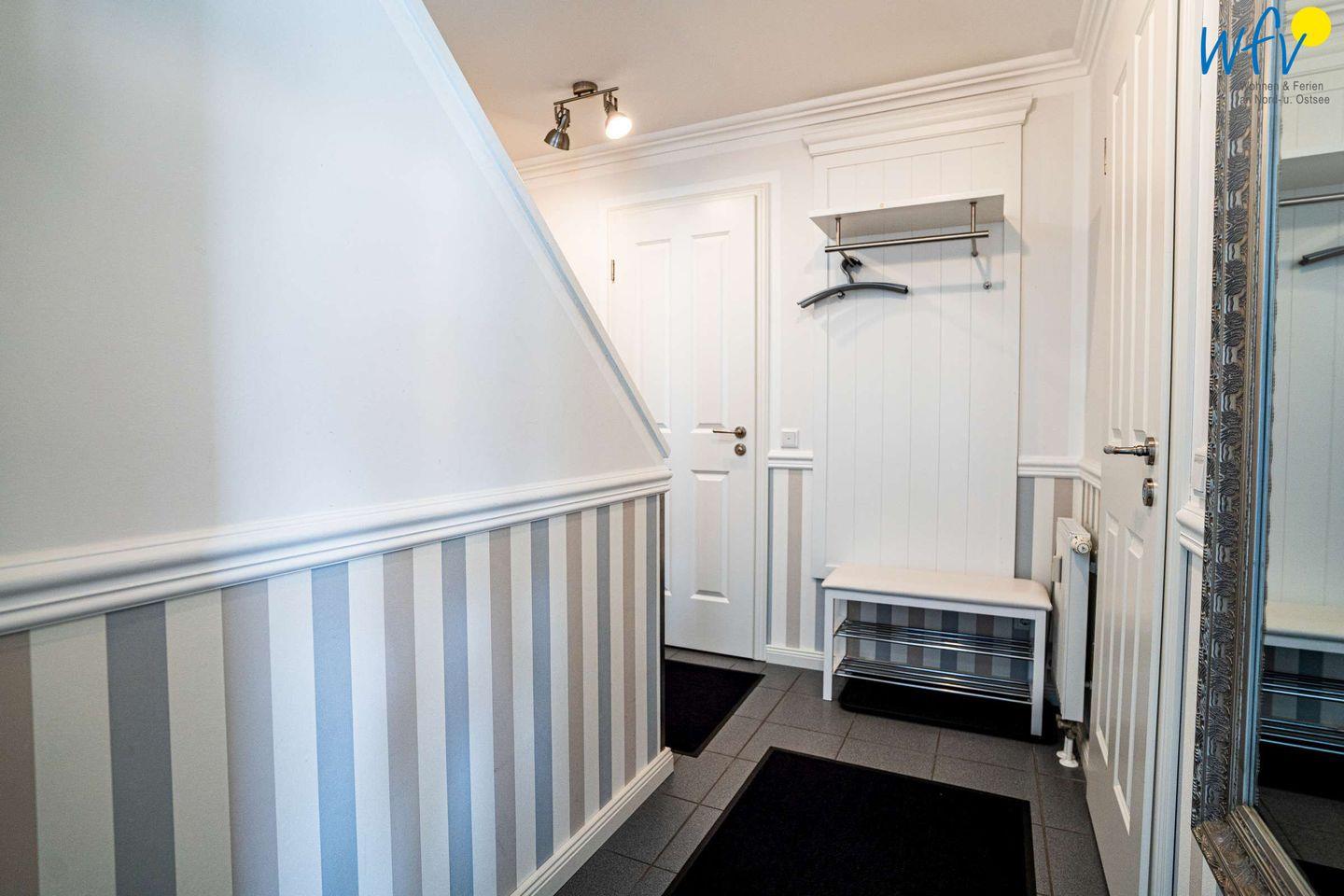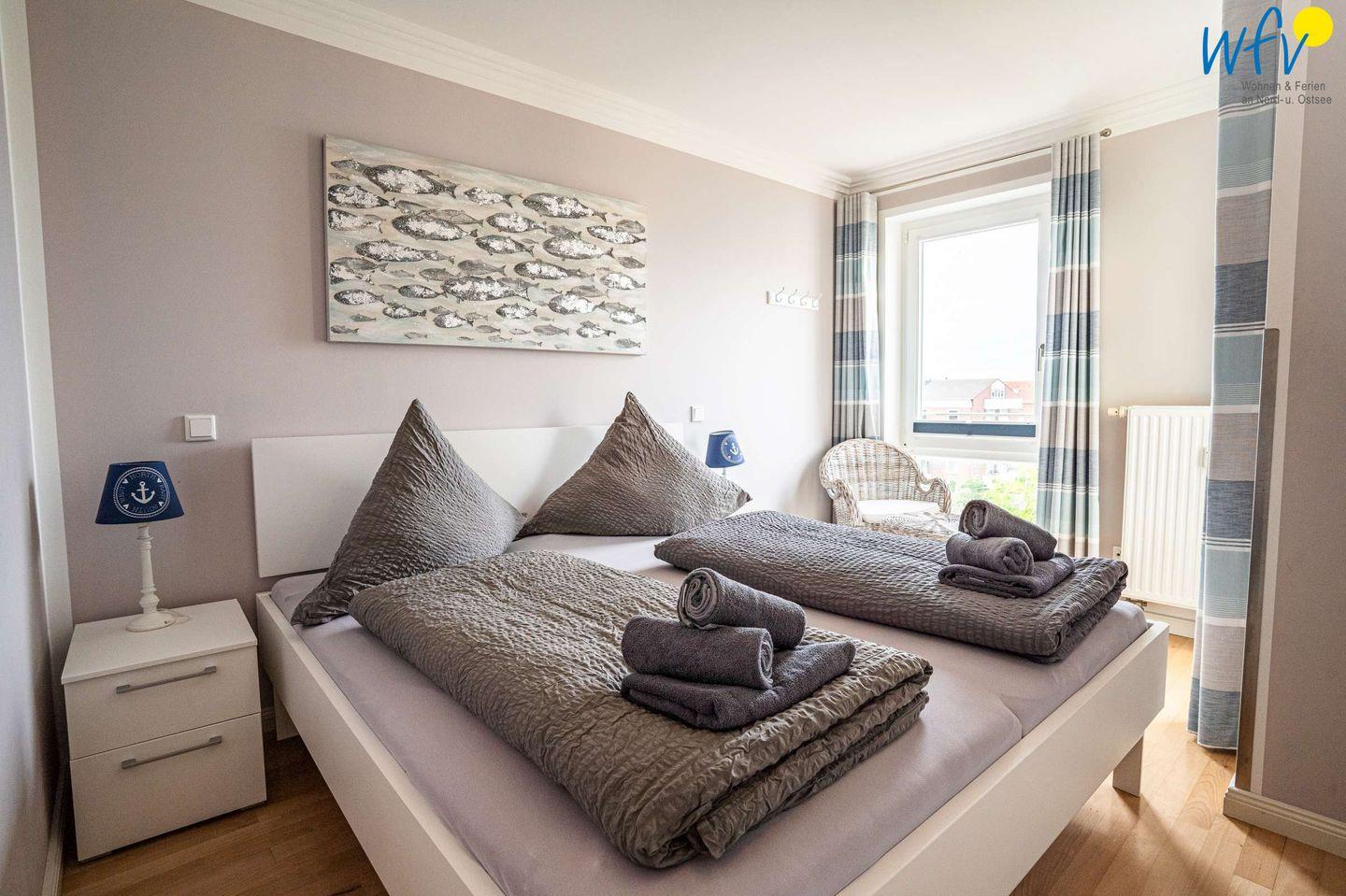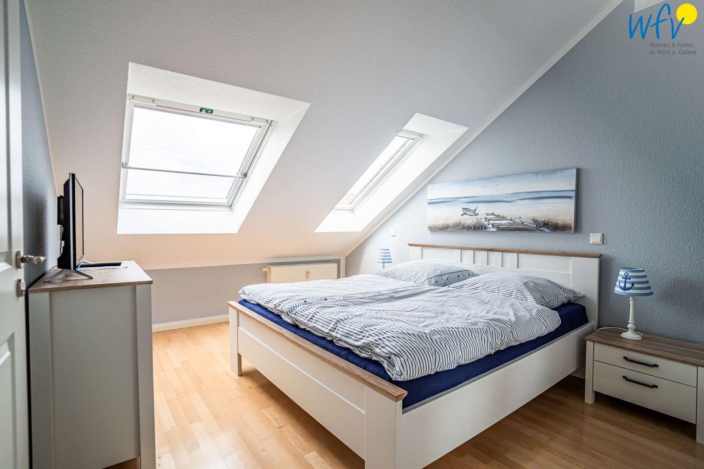 Die Ferienwohnung erstreckt sich über das 3. und 4. OG des Hauses. Helle Räume in harmonischen Farben mit maritimem Flair sorgen für eine sehr freundliche Atmosphäre und das entsprechende Nordseegefühl. In der ersten Etage der Ferienwohnung befinden sich ein geräumiger Wohn-Essbereich, ein separates Schlafzimmer, eine Küche und ein Bad. Im Dachgeschoss liegen drei weitere separate Schlafzimmer sowie ein zusätzliches Bad. Zwei der Schlafzimmer sind mit einem Doppelbett ausgestattet, die anderen beiden mit zwei Einzelbetten bzw. einem Einzelbett. Für unsere kleinsten Gäste ist ein Kinderbett vorhanden.