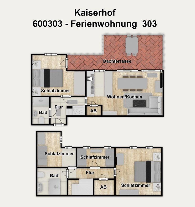 Unsere komfortable Ferienwohnung 303 im "Kaiserhof" auf Wangerooge bietet Ihnen mit vier separaten Schlafzimmern und Dachterrasse einen wunderbaren Wohlfühlort. Hier können Sie sich im Urlaub mit der Familie oder mit Freunden rundum erholen.