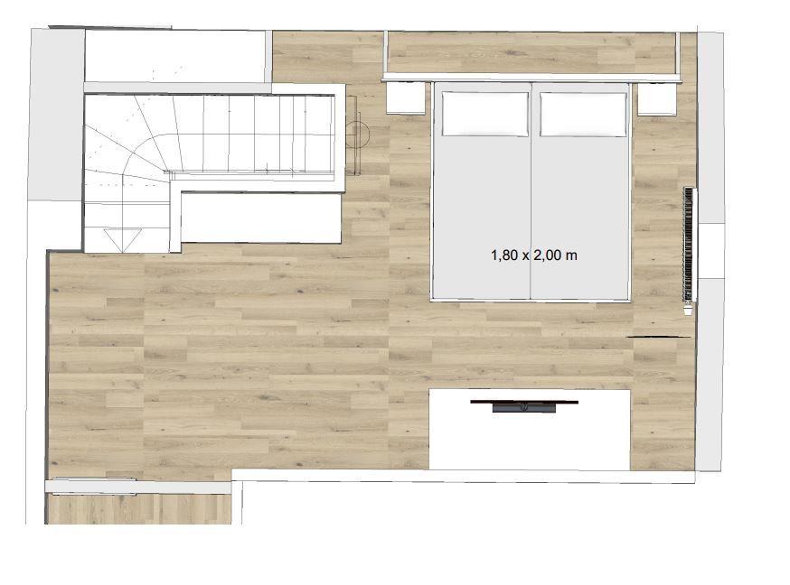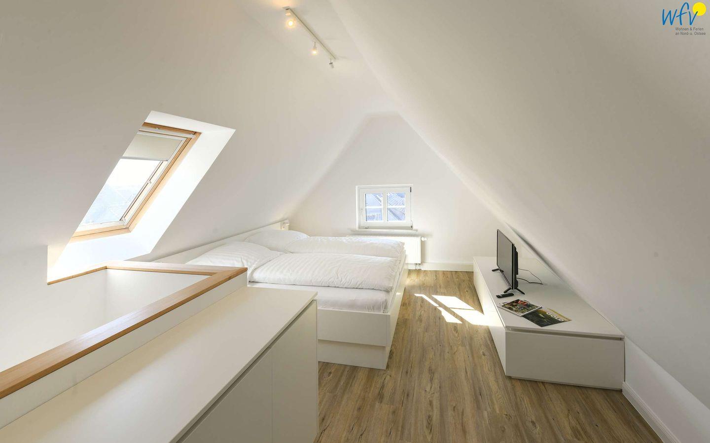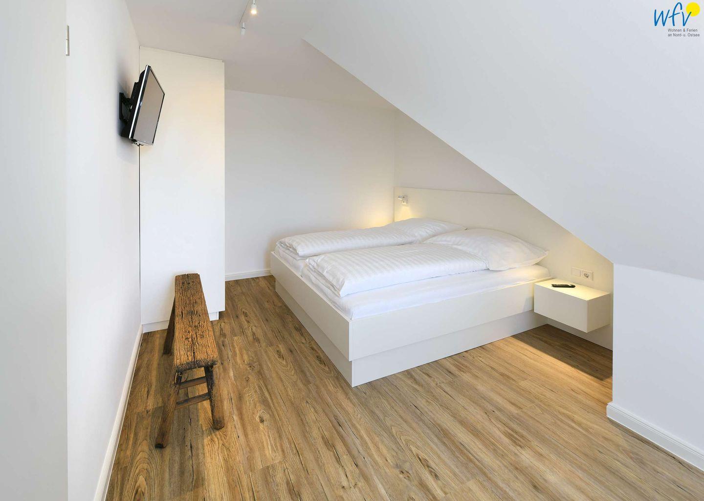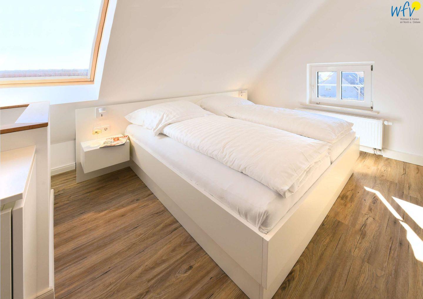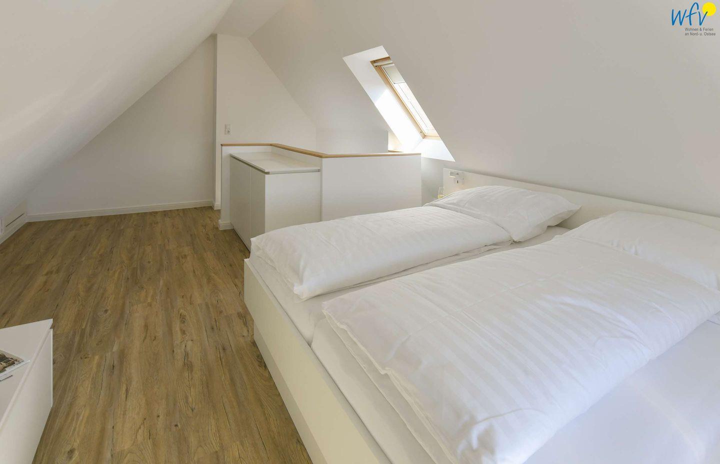 Das separate Schlafzimmer mit Doppelbett im Obergeschoss ist durch die Dachschräge sehr gemütlich. Dort finden Sie zudem noch einen kleinen Abstellraum mit Staubsauger, Wäscheständer,… auch Ihre Koffer haben hier Platz für eine kleine Reisepause. Achtung: die Treppe ist leicht steil und für Kleinkinder eher nicht geeignet.