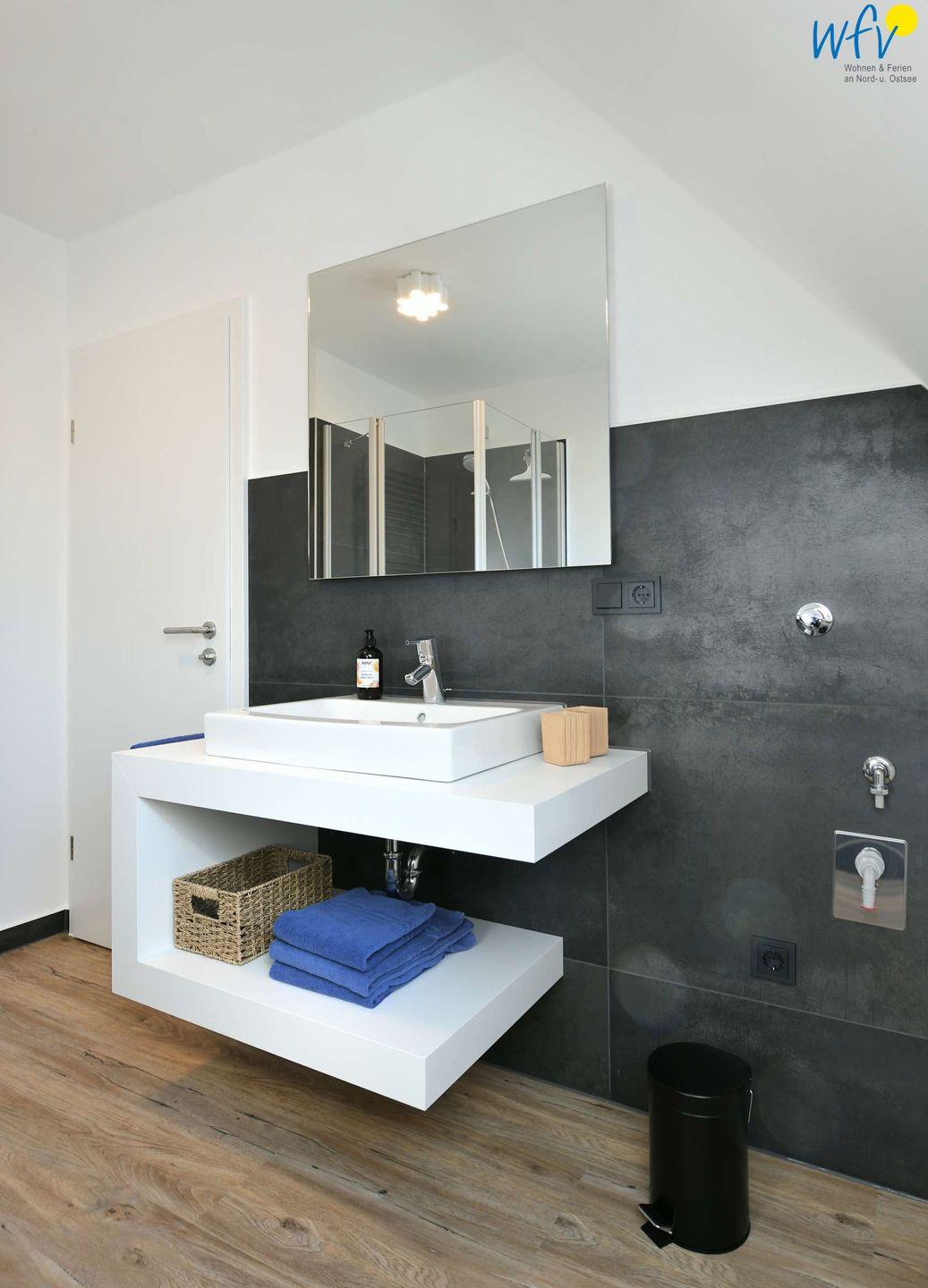 Das Badezimmer ist klar und modern gehalten - u.a. mit großformatigen Fliesen und einem großen hinterleuchteten Spiegel. Eine Waschmaschine steht zur Verfügung.