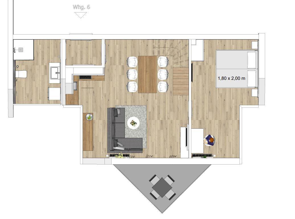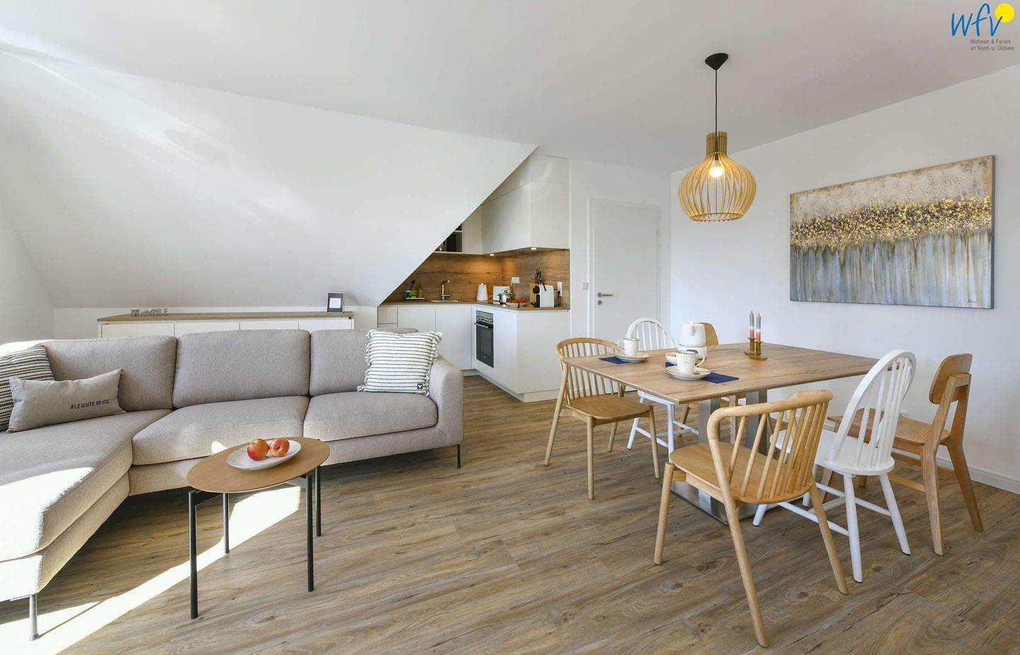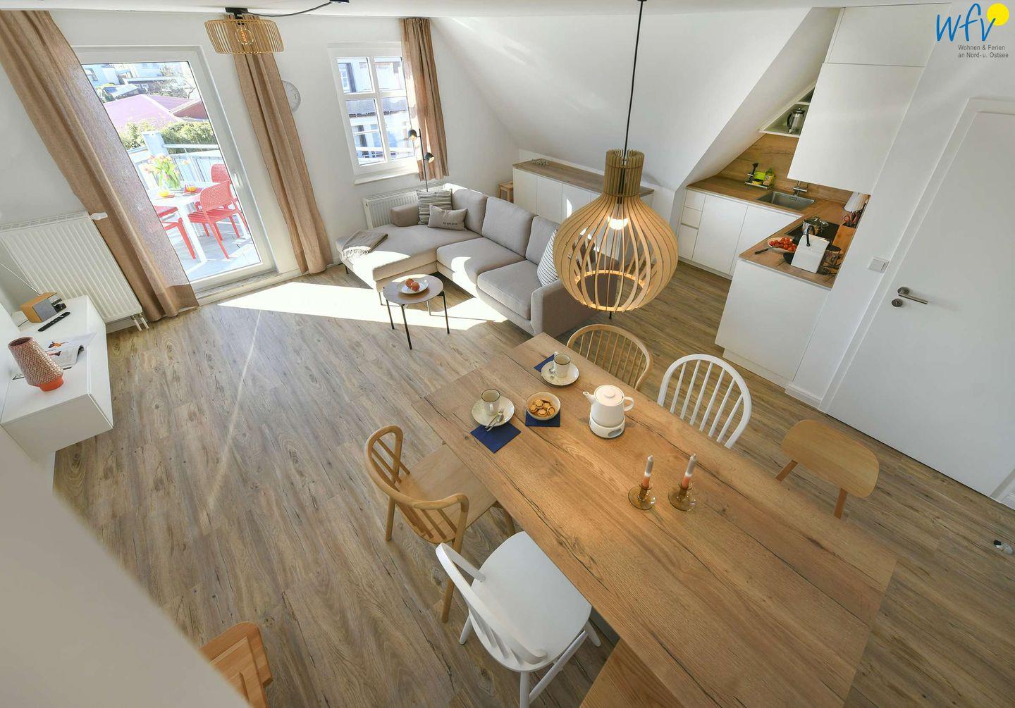 Vom sonnigen West-Balkon haben Sie einen herrlichen Blick über die Zedeliusstraße und zum Dorfbrunnen. Der großzügige Wohnraum mit Esstisch, gemütlichem Ecksofa und stillvoller Küche sowie einem Zugang zum Balkon lässt die Bewohner in geselliger und großzügiger Atmosphäre lange Tage und Nächte verbringen.
