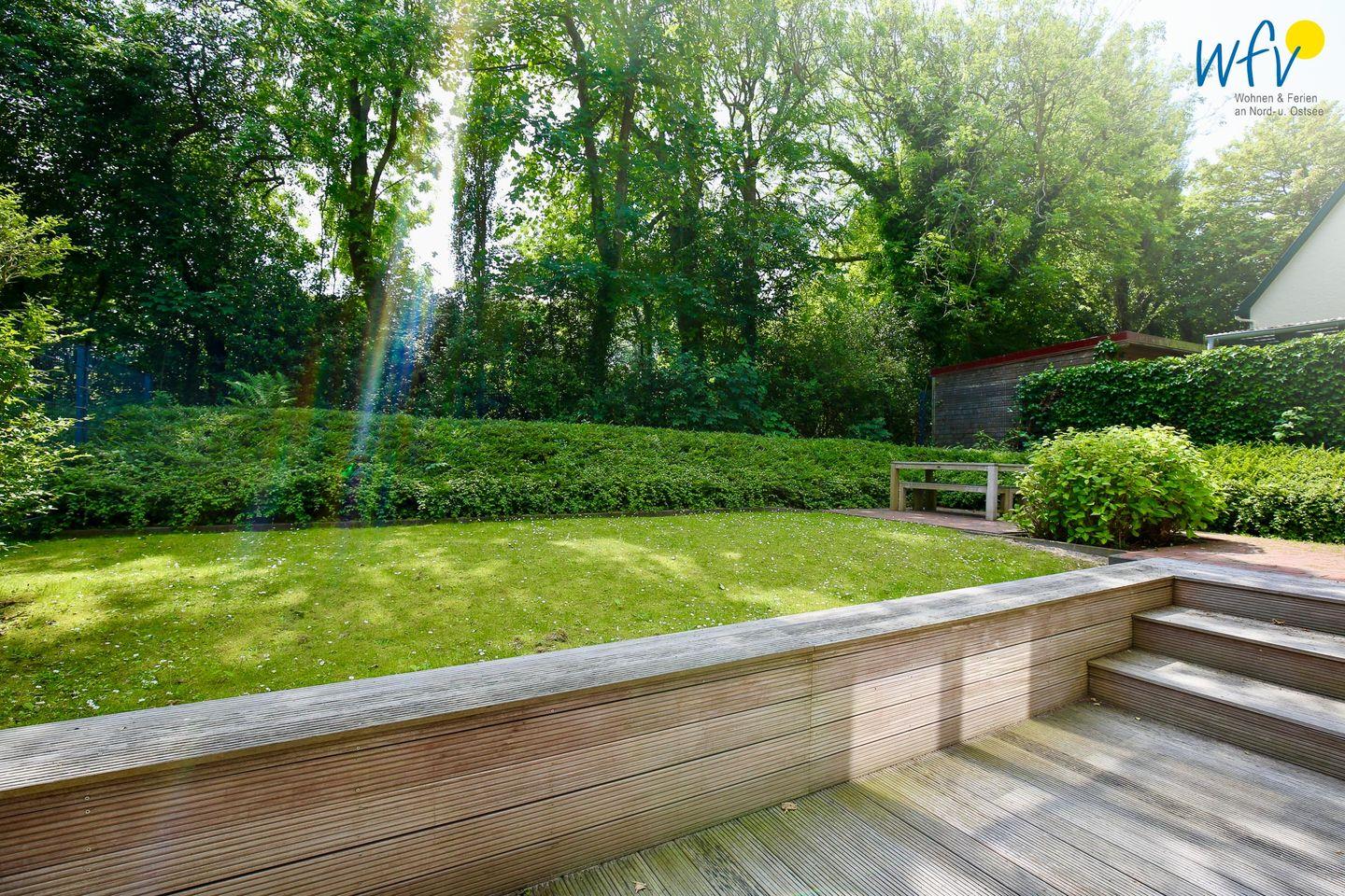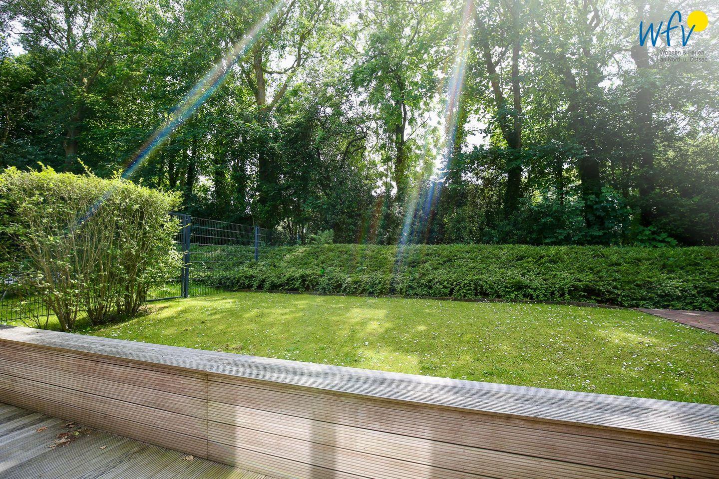 Besonders schön ist die große windgeschützte Terrasse mit direktem Zugang zum großen Garten. Hier können Sie wunderbar entspannen und die Seele baumeln lassen! (Fußboden und Terrasse der Souterrainwohnung liegen nur ca. 60 cm tiefer als das übrige Erdreich.)