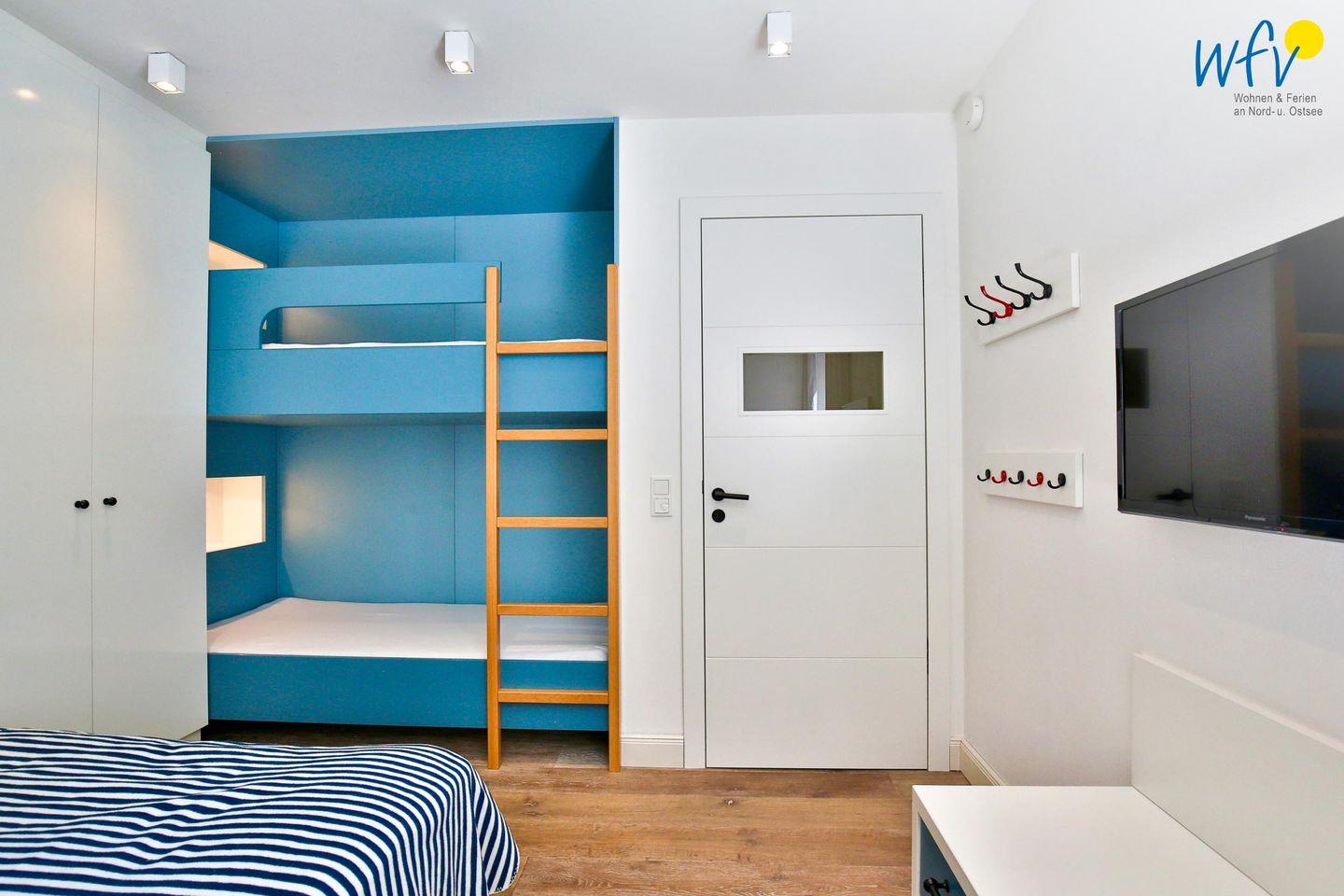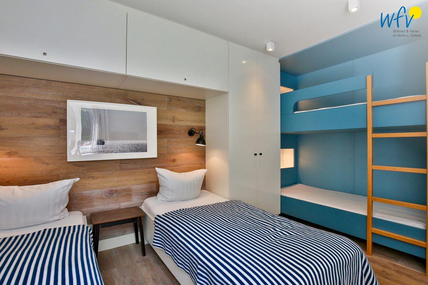 Zum ausgiebigen Ausschlafen locken die herrlich bequemen Betten der Ferienwohnung! In zwei separaten Schlafzimmern bieten zwei Doppelbetten und ein Etagenbett Platz für sechs Personen. Bei Bedarf kann das Ausziehsofa ebenfalls als Schlafmöglichkeit genutzt werden, es lässt sich durch eine Schiebetür vom Wohnraum trennen.
