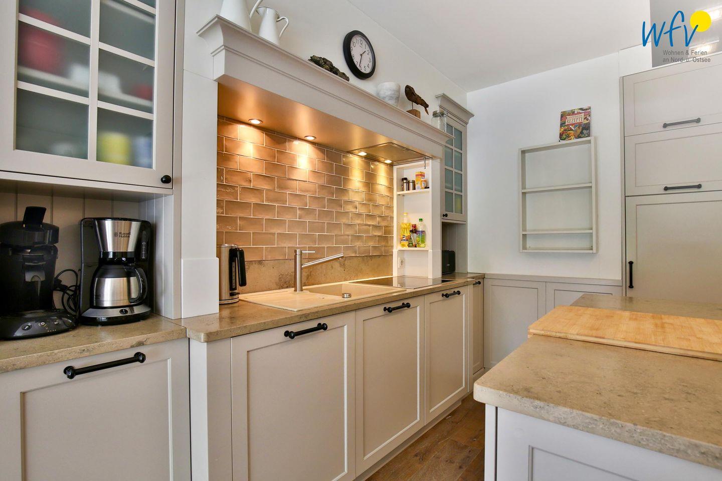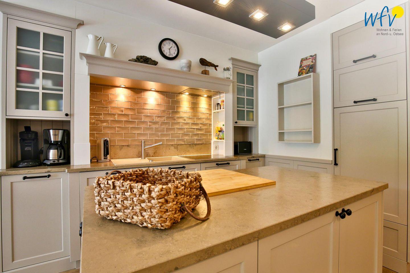 Auch an die Kochfans haben wir gedacht! In der modernen Landhausküche finden Sie komfortable Extras, wie Cerankochfeld, Mikrowelle, Geschirrspüler und Arbeitsflächen aus Granit. Der freistehende Küchenblock und der große Esstisch laden zum gemeinsamen Kochen und Essen ein. Zusätzlich vorhandene technische Geräte sind Wasserkocher, Toaster, Kaffeemaschine, Handmixer und Außengrill.