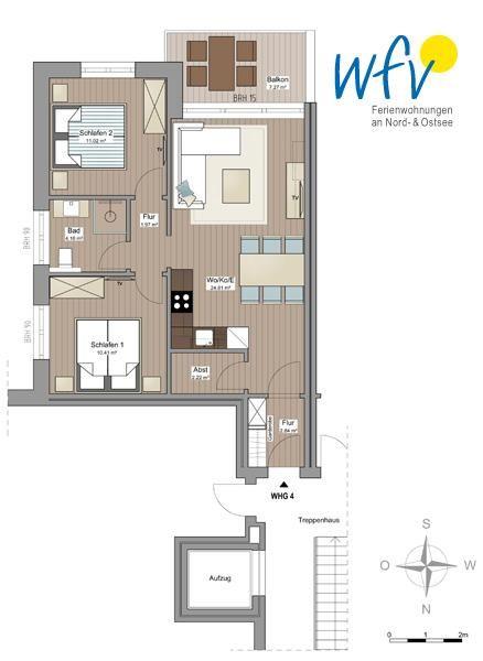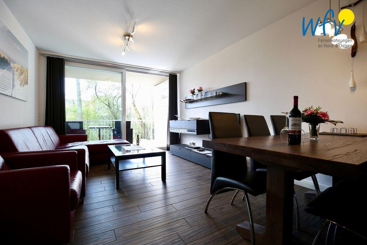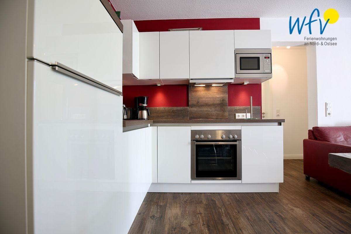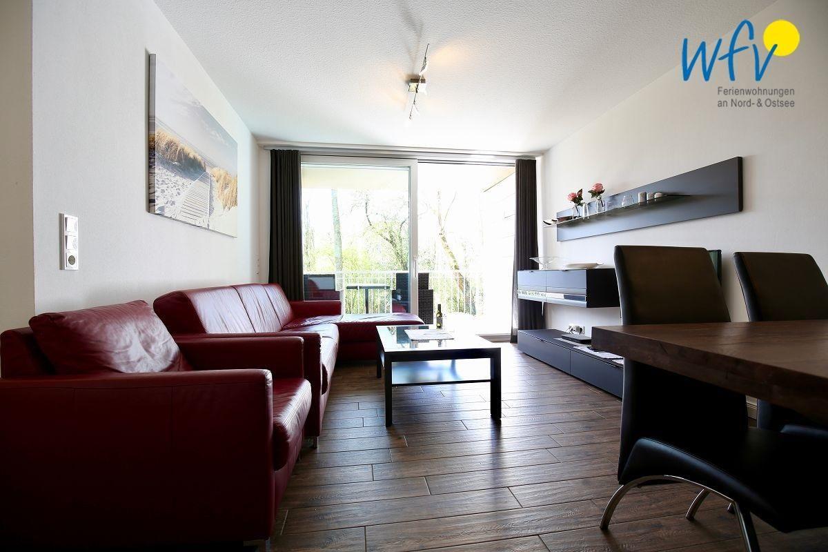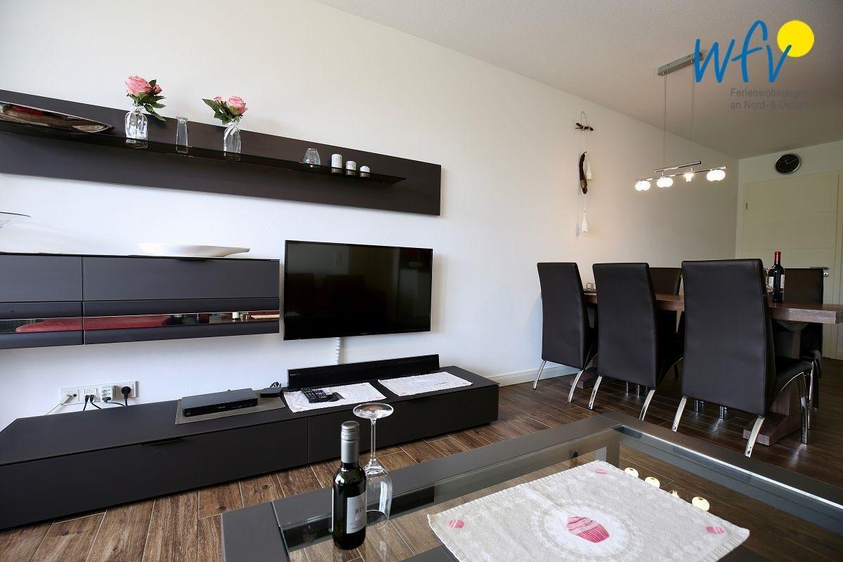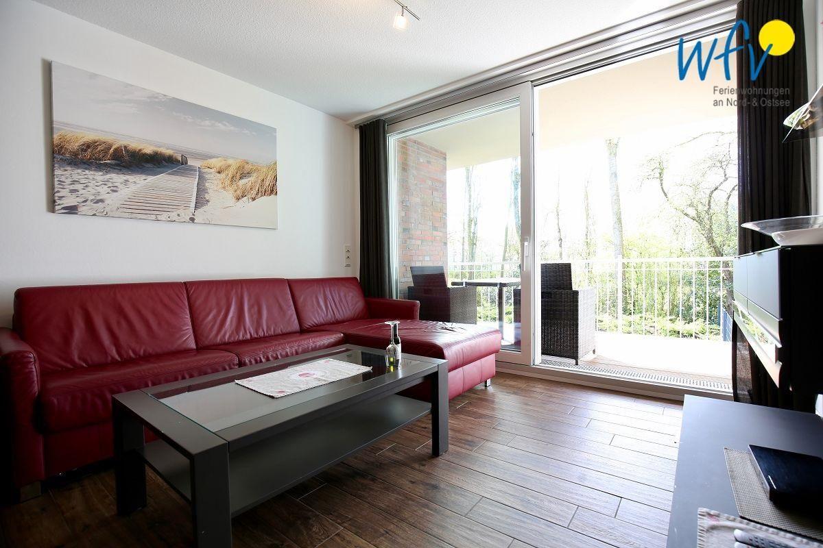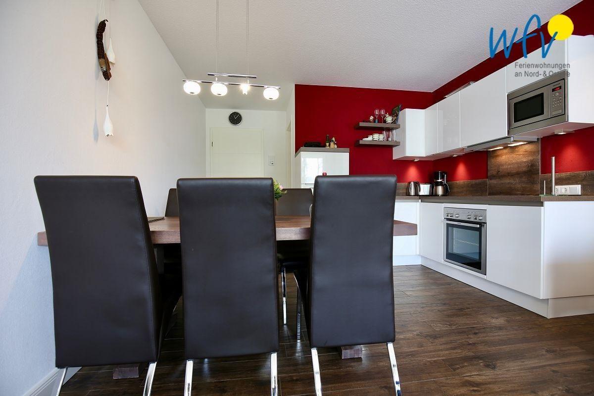 Ob Sie im Wohnbereich gemütlich relaxen, auf dem Balkon die Nordseeluft genießen oder in der Küche leckere Gerichte zaubern - Sie können bei uns zu 100% entspannen! Der komfortable Koch-Essbereich bildet einen offenen Übergang zum geräumigen Wohnbereich, der mit einer bequemen Couchecke sowie einem Flatscreen TV, Radio und DVD-Player ausgestattet ist. Auch in den Schlafzimmern befinden sich Flatscreens. Auf dem hübsch möblierten Balkon haben Sie einen schönen Blick ins Grüne - ideal, um nach Herzenslust die Seele baumeln zu lassen!