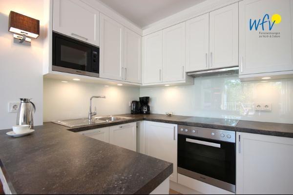 Der helle und offene Wohn-Ess-Bereich mit Zugang zum Südbalkon und sehr guter Küchenausstattung (u.a. mit Mikrowelle und Geschirrspüler) ermöglicht es Ihnen, auch im Urlaub bequem zu kochen und lange Abende am Küchentisch oder auf dem Balkon zusammen mit Familie und Freunden zu genießen. Eine zusätzliche Gefriermöglichkeit befindet sich im Abstellraum.