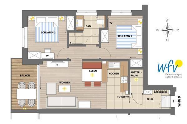 Apple-TV, drei moderne Flatscreens, Radio, DVD-Player sowie Wlan stehen Ihnen in dieser Ferienwohnung auf Wangerooge zur freien Verfügung - selbstverständlich kostenlos.