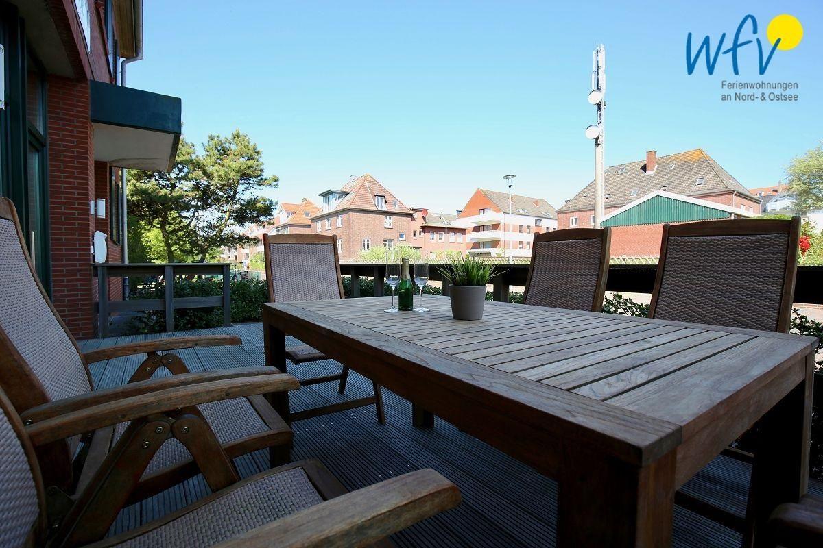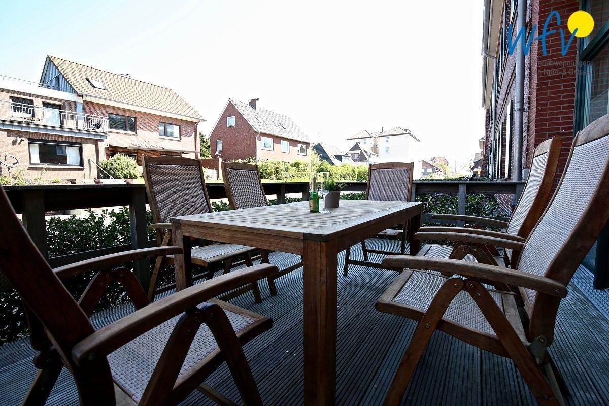 Herrlich relaxen können Sie zum Beispiel in dem 50 m² großen Wohnraum mit hochwertiger Couchecke. Für Unterhaltung stehen hier ein modernes Flat-TV mit Soundbar und ein Bluray-Player bereit, für gemeinsame Mahlzeiten oder Spieleabende ein großer Esstisch. Auch die Terrasse garantiert pure Erholung: bequeme Balkonmöbel laden zum gemütlichen Entspannen bei Sonne und frischer Nordseeluft ein!
