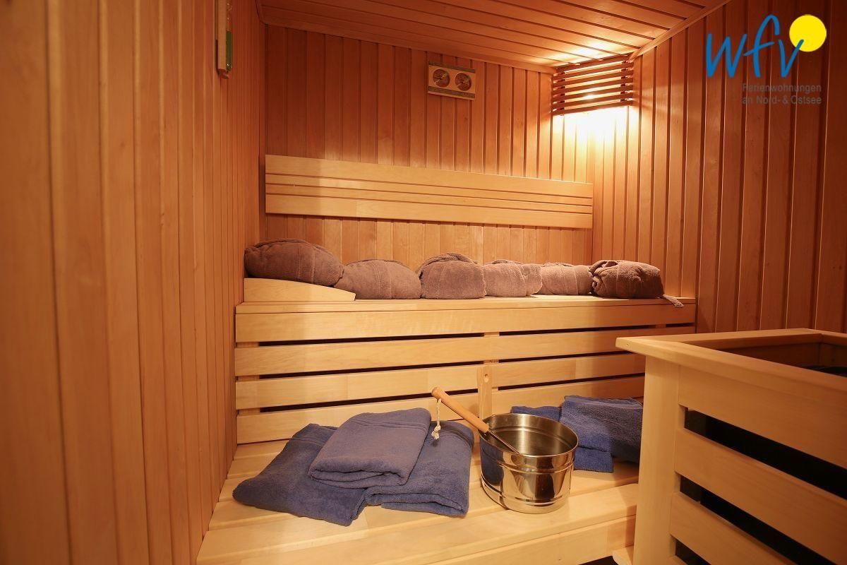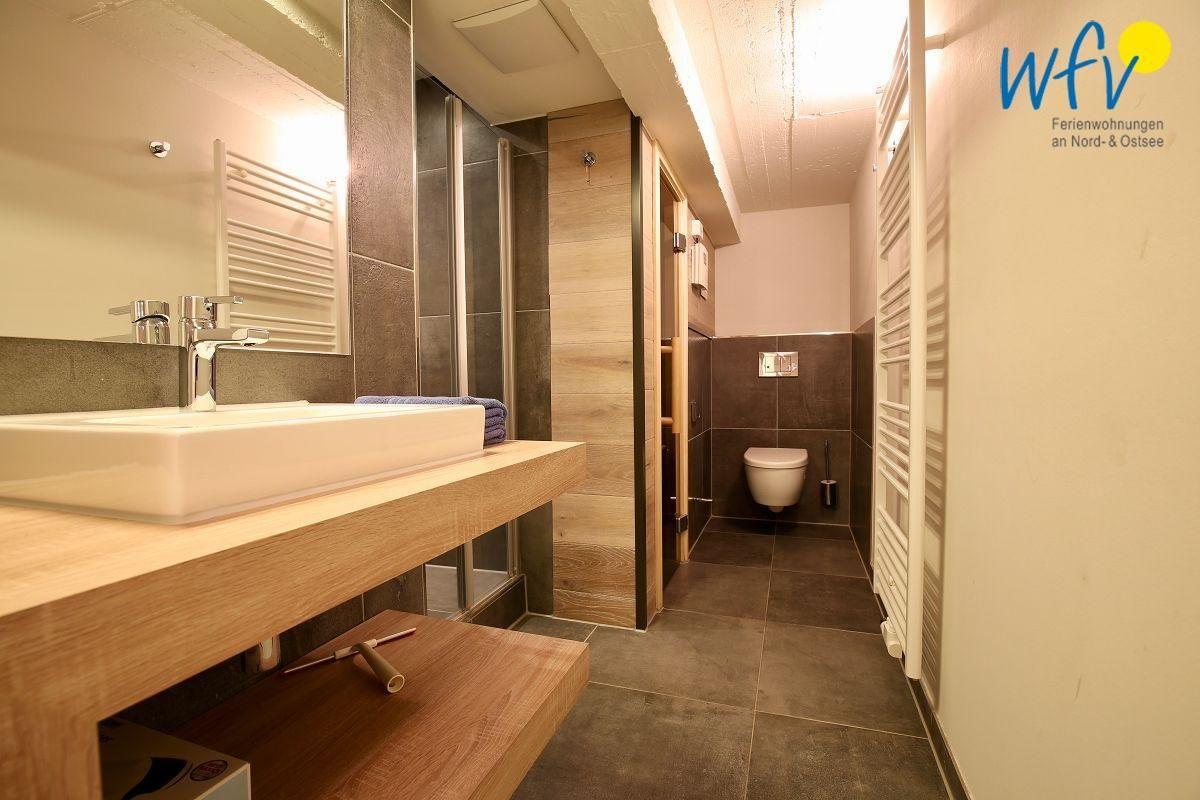 Im Souterrain erwartet Sie ein weiteres Highlight der Ferienwohnung auf Wangerooge: die Sauna! Perfekt für erholsame Relaxmomente nach dem ausgiebigen Strandspaziergang.