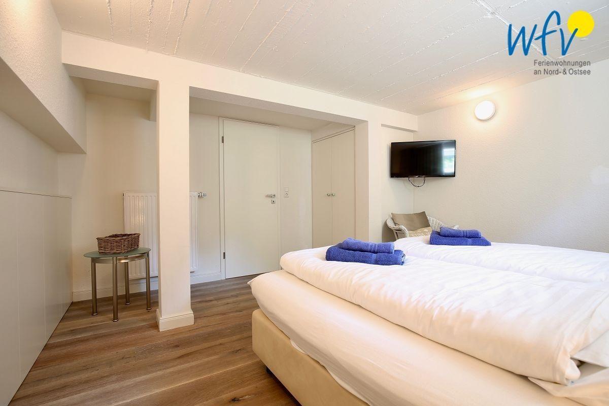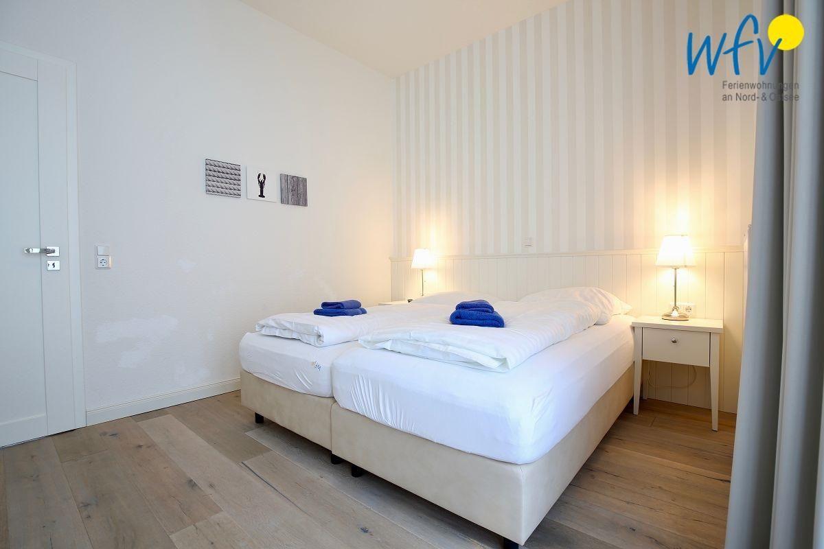 Im Erdgeschoss der Wangerooger Ferienwohnung liegen ein Badezimmer, zwei separate Schlafzimmer mit Boxspringbetten und Flat-TVs und der große Wohn/Essbereich mit direktem Zugang zur Terrasse. Eines der Schlafzimmer hat darüber hinaus einen Zugang zum Südbalkon.