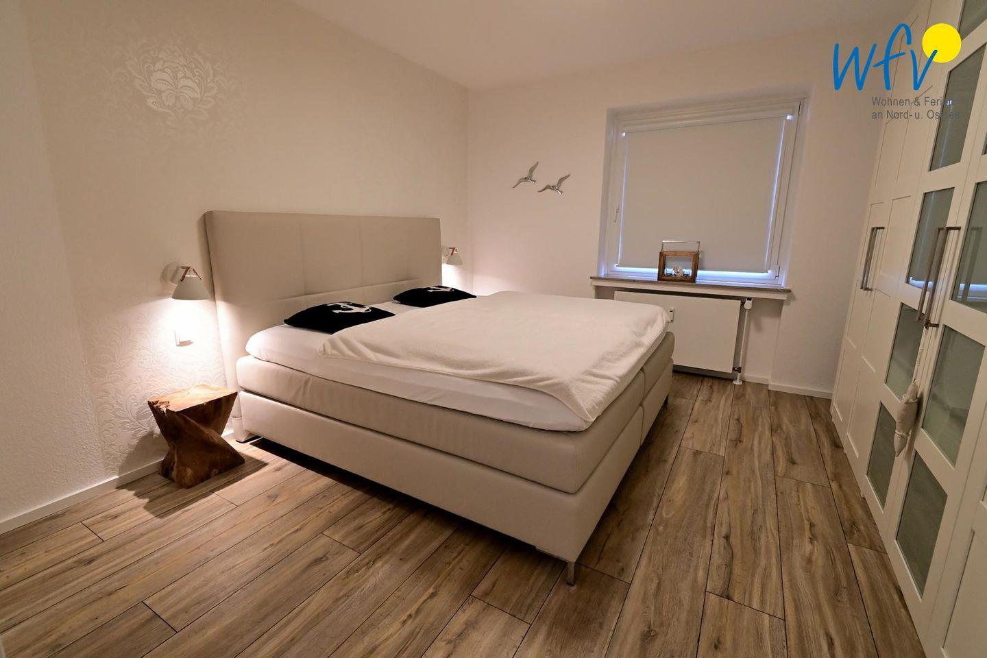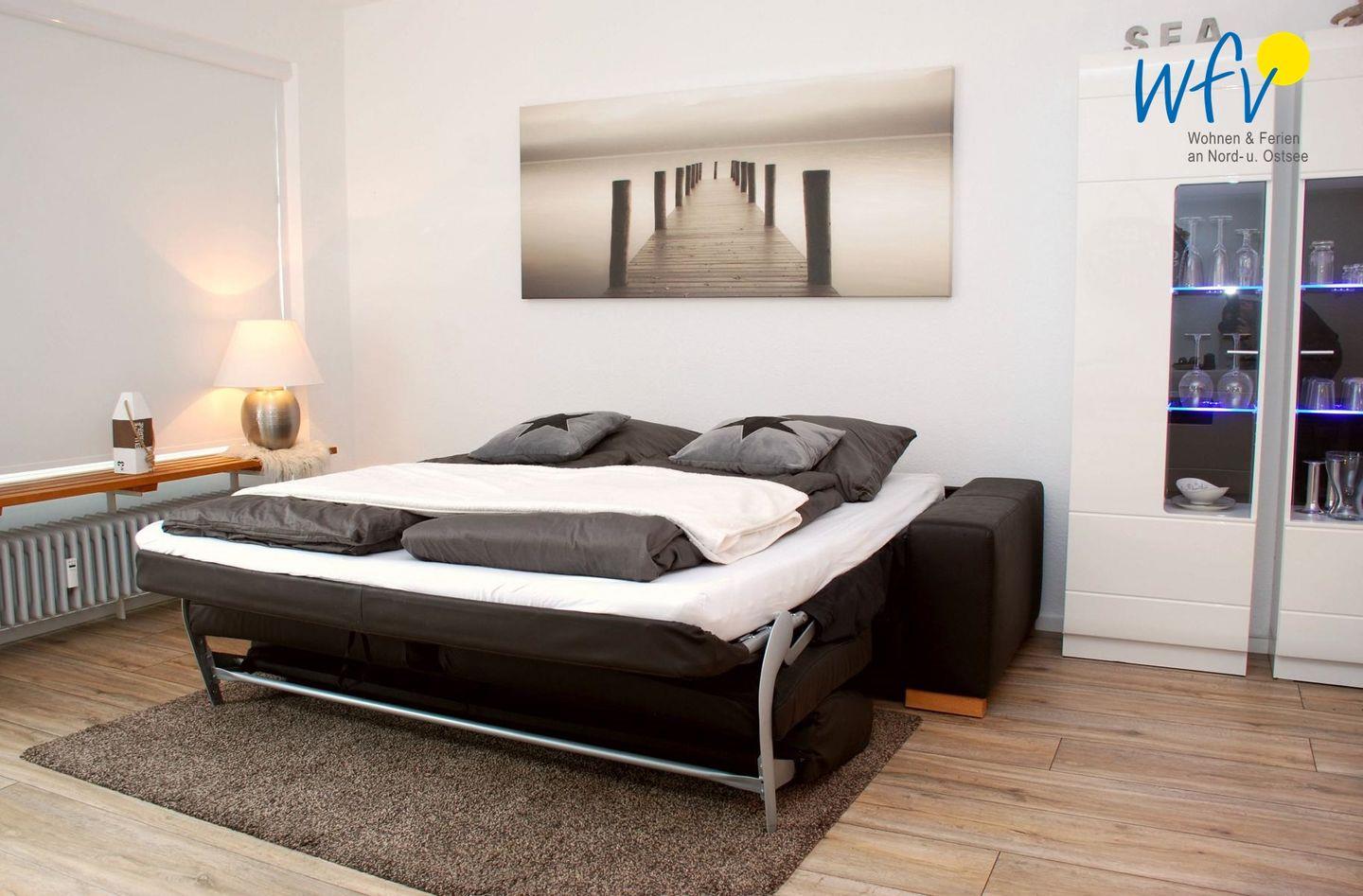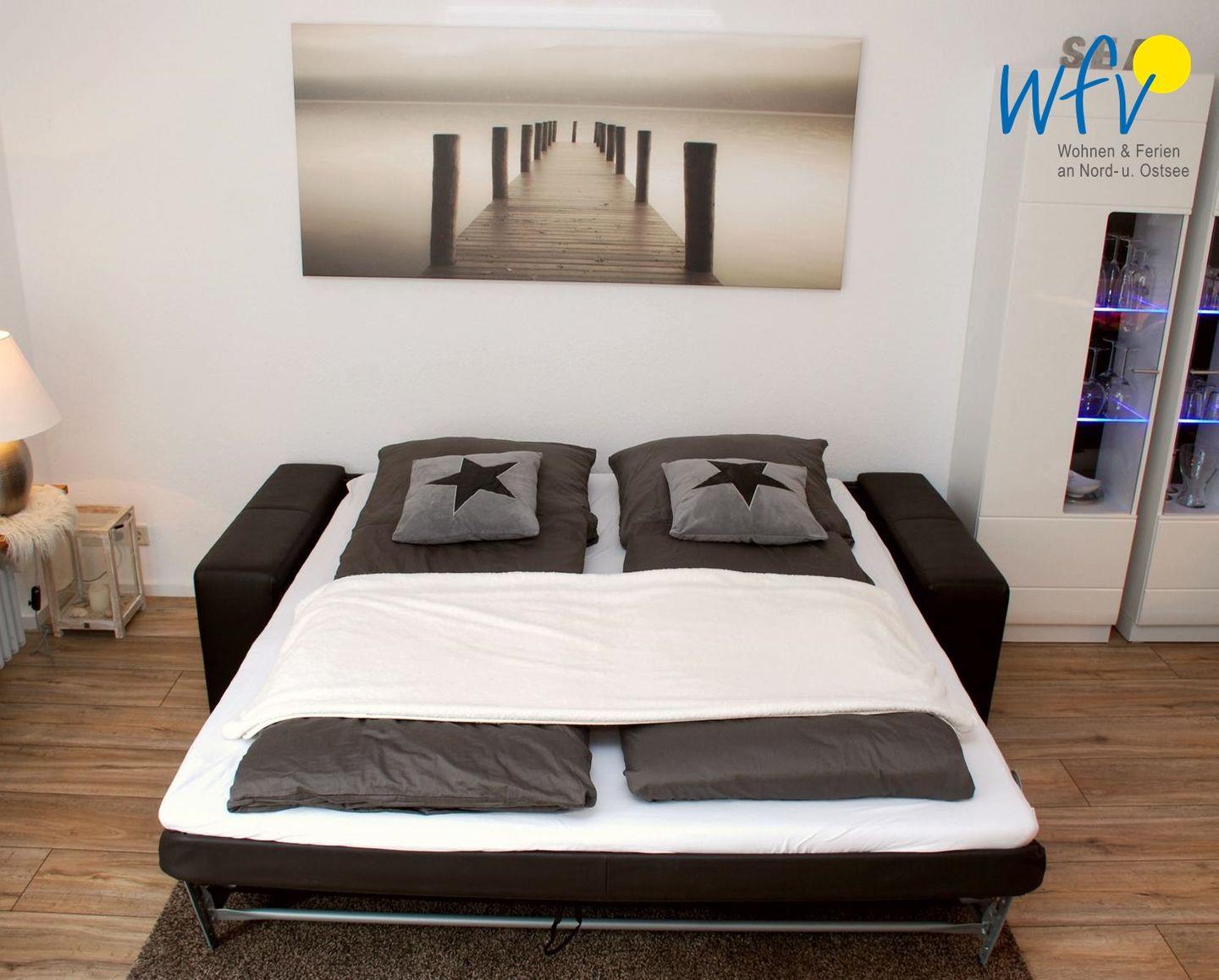 Wenn Wangerooge schlafen geht, wartet auf Sie ein hochwertiges Boxspringbett (200x200 cm) im separaten Schlafzimmer. Im Wohnzimmer bietet ein erstklassiges Schlafsofa (165x200 cm) mit einfach zu bedienender Mechanik Schlafkomfort für zwei weitere Personen.