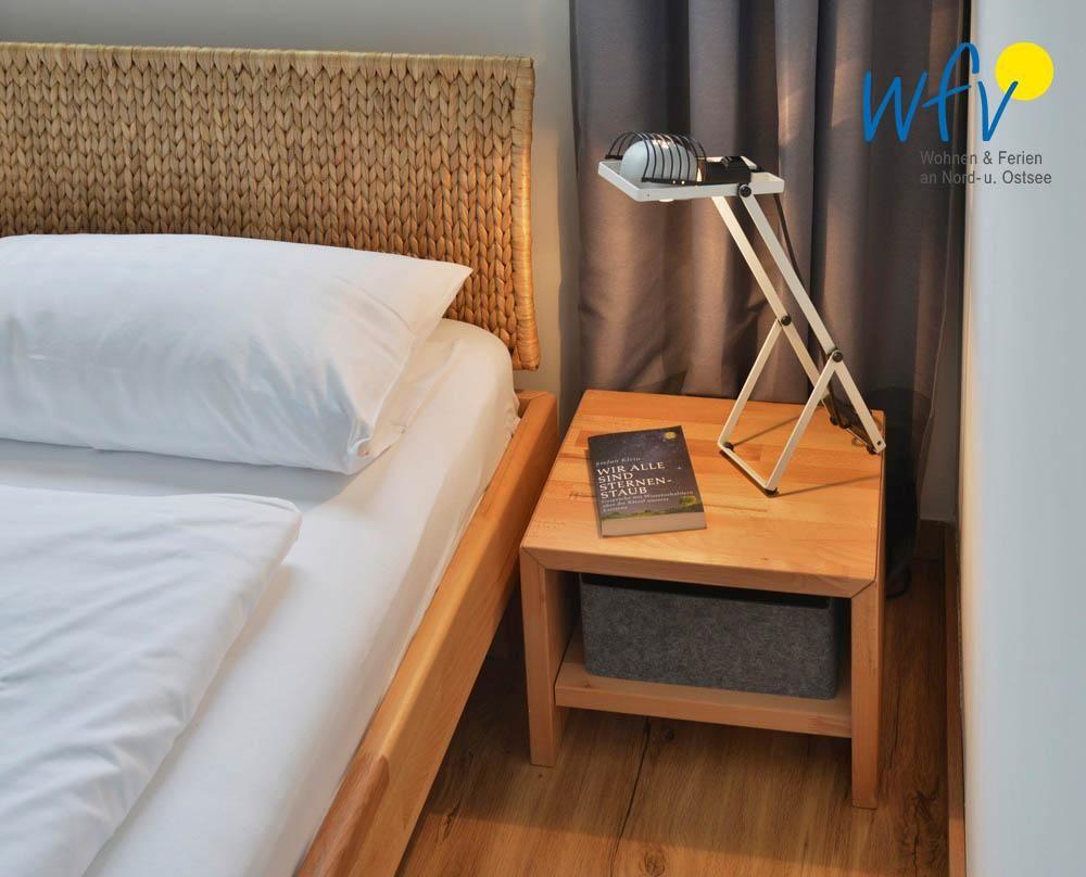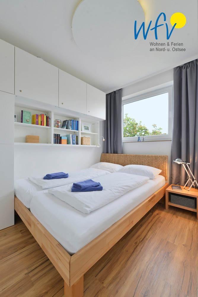 Das separate Schlafzimmer der Wangerooger Ferienwohnung ist mit einem bequemen Doppelbett (b: 160 cm) ausgestattet; im Wohnraum befindet sich eine komfortable Schlafcouch (inkl. Lattenrost) für zwei zusätzliche Schlafgelegenheiten.