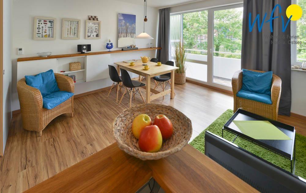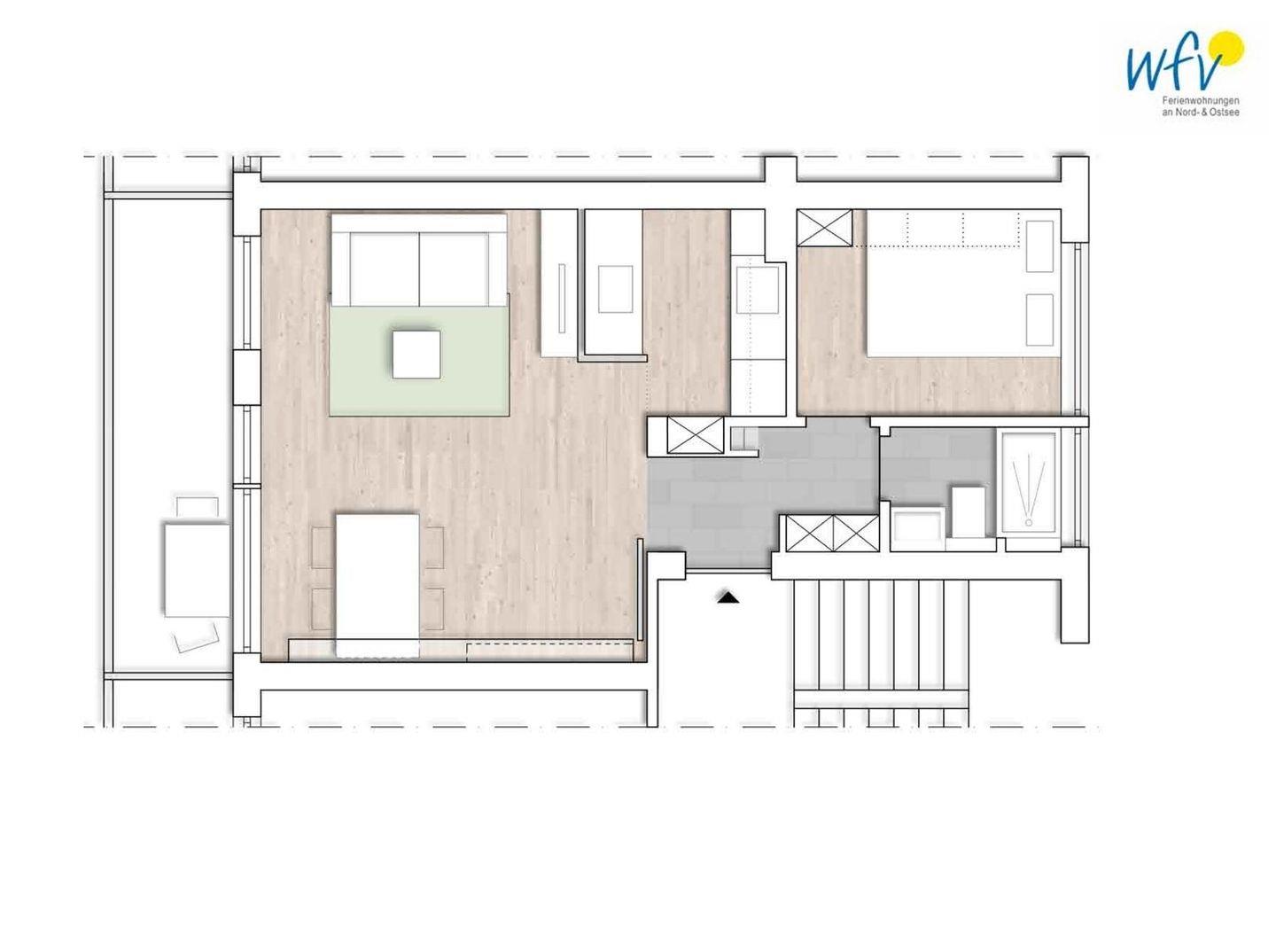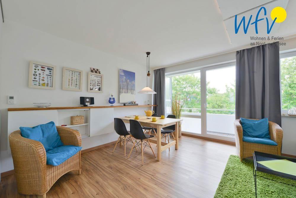 In dieser Wangerooger Ferienwohnung erwartet Sie ein heller, sonniger Wohnraum mit Blick ins Grüne, ein separates Schlafzimmer, eine Küchenzeile mit Essecke, ein modernes Duschbad sowie ein sonniger Balkon.