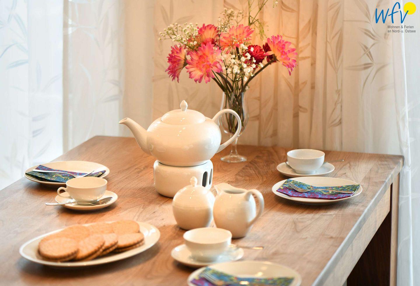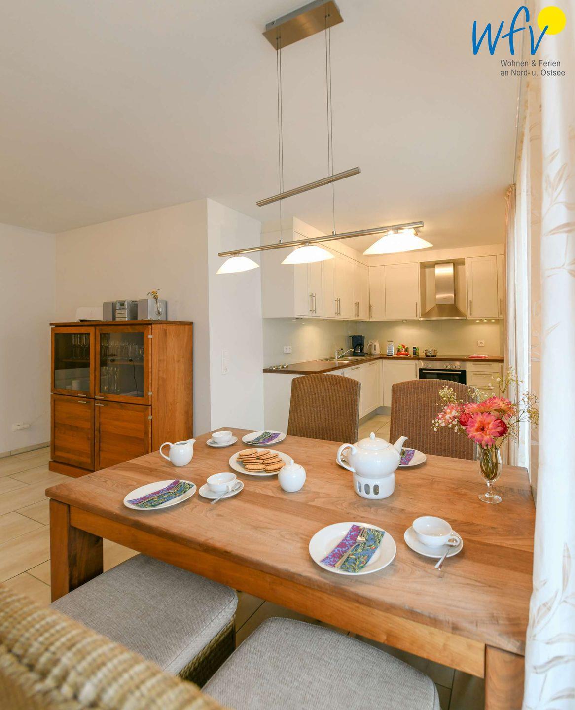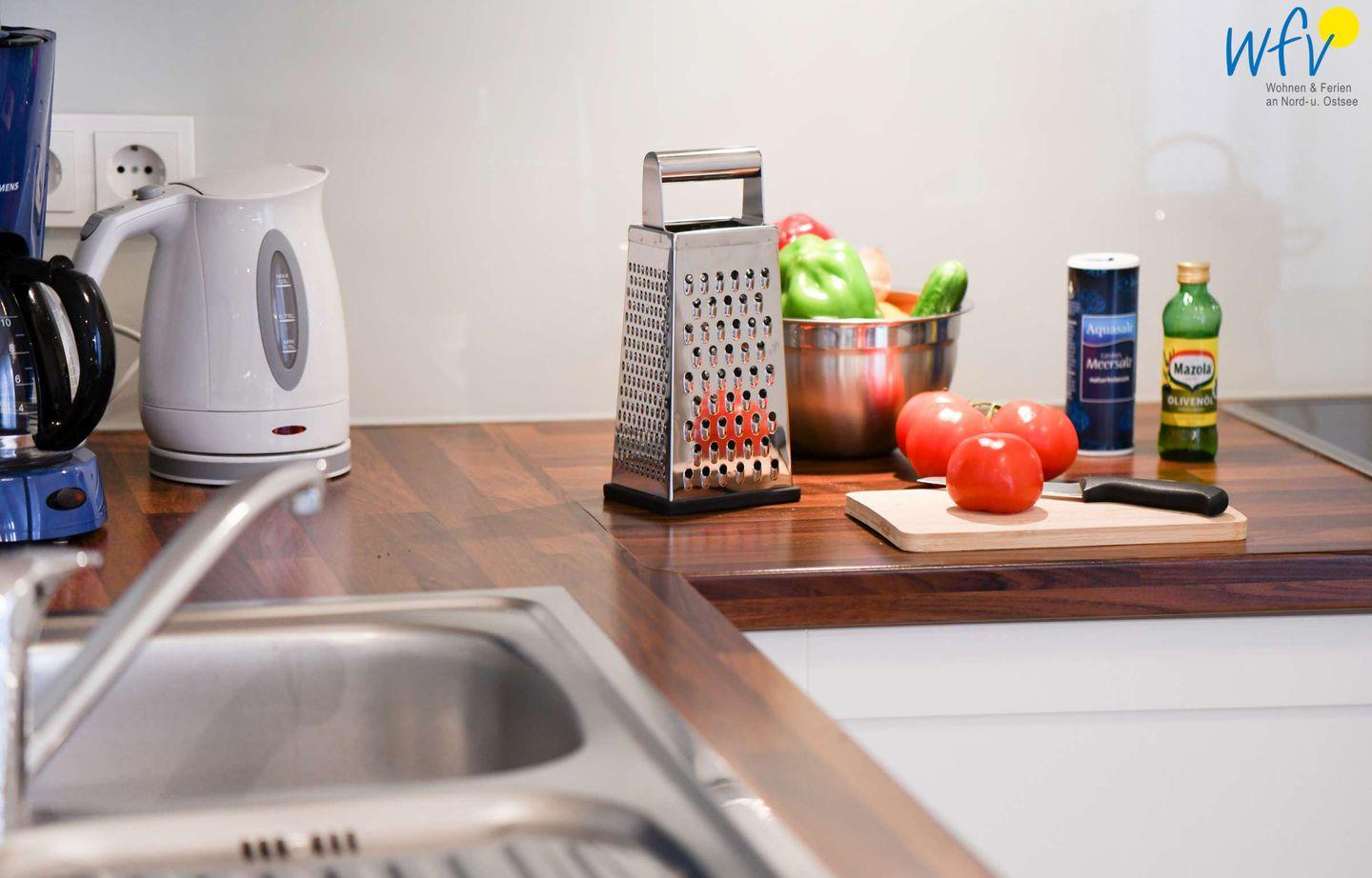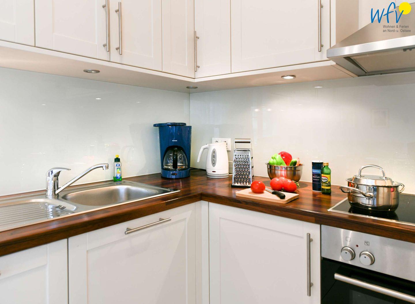 Wir garantieren Ihnen eine bequeme Selbstverpflegung in Ihrem Wangerooge-Urlaub! Die komfortable Einbauküche verfügt u.a. über einen Backofen mit Ceranfeld, eine Mikrowelle und eine Spülmaschine. Diverse Kleingeräte wie Toaster, Wasserkocher und Kaffeemaschine sind selbstverständlich ebenfalls vorhanden.