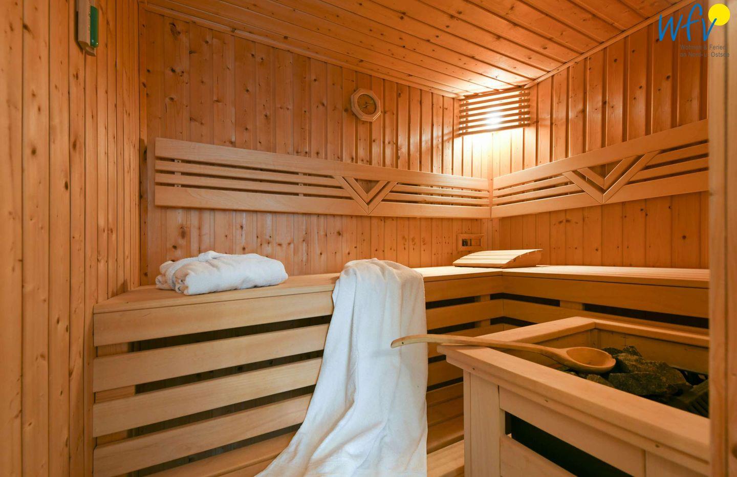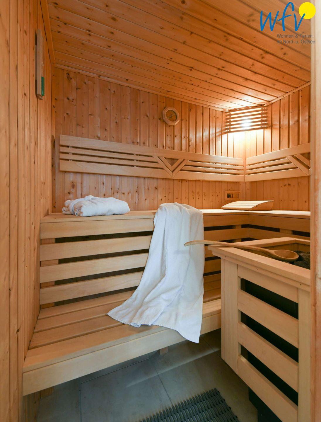 Sich in der eigenen Sauna nach einem ausgiebigen Strandspaziergang zu entspannen, lässt ein herrliches Urlaubsgefühl aufkommen! Oder Sie genießen ein Sonnenbad auf dem Balkon! Hübsche Holzmöbel sowie ein Sonnenschirm und ein bequemer Strandkorb machen den Balkon der Ferienwohnung zu einer absoluten Relax-Oase.