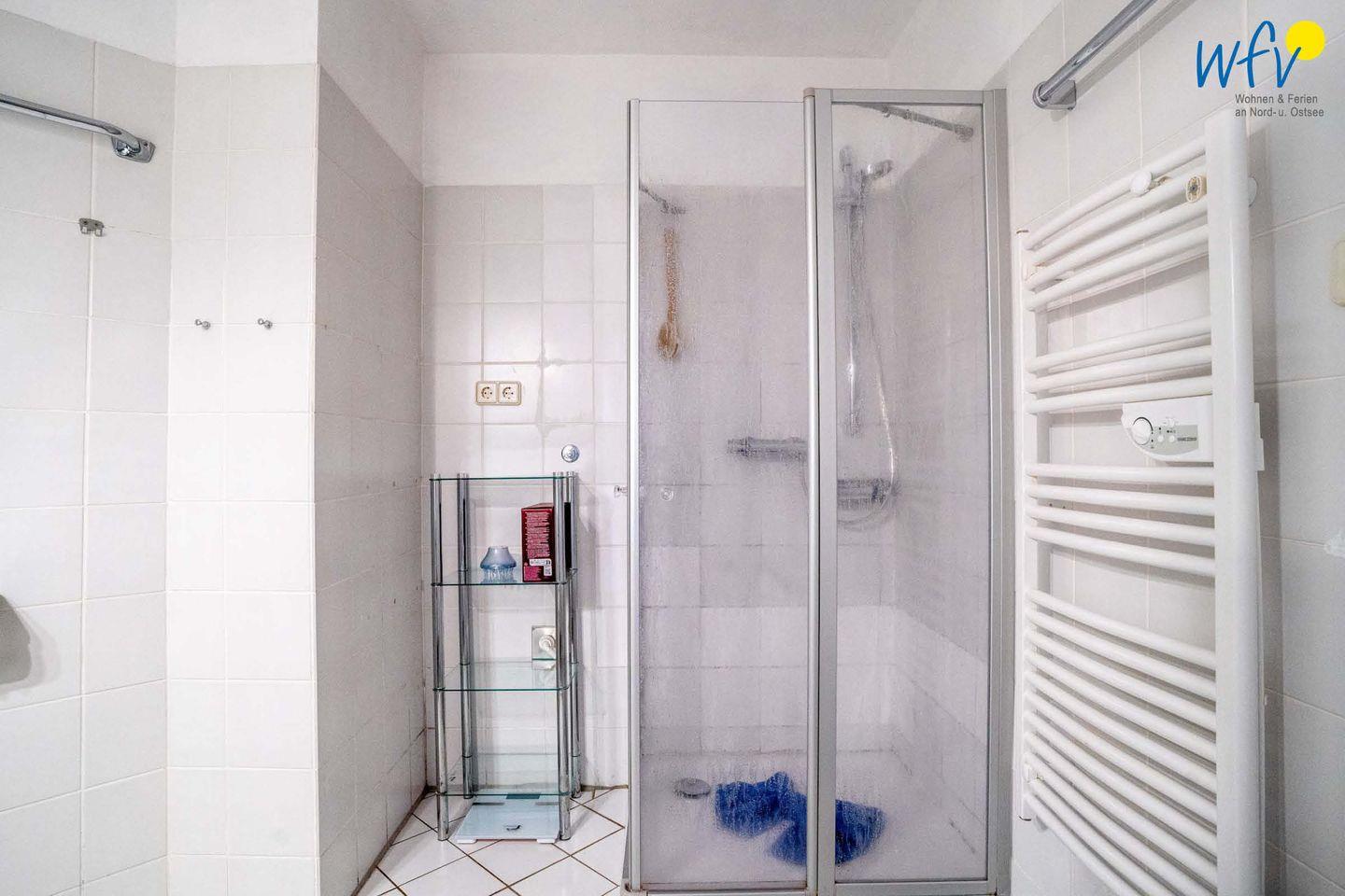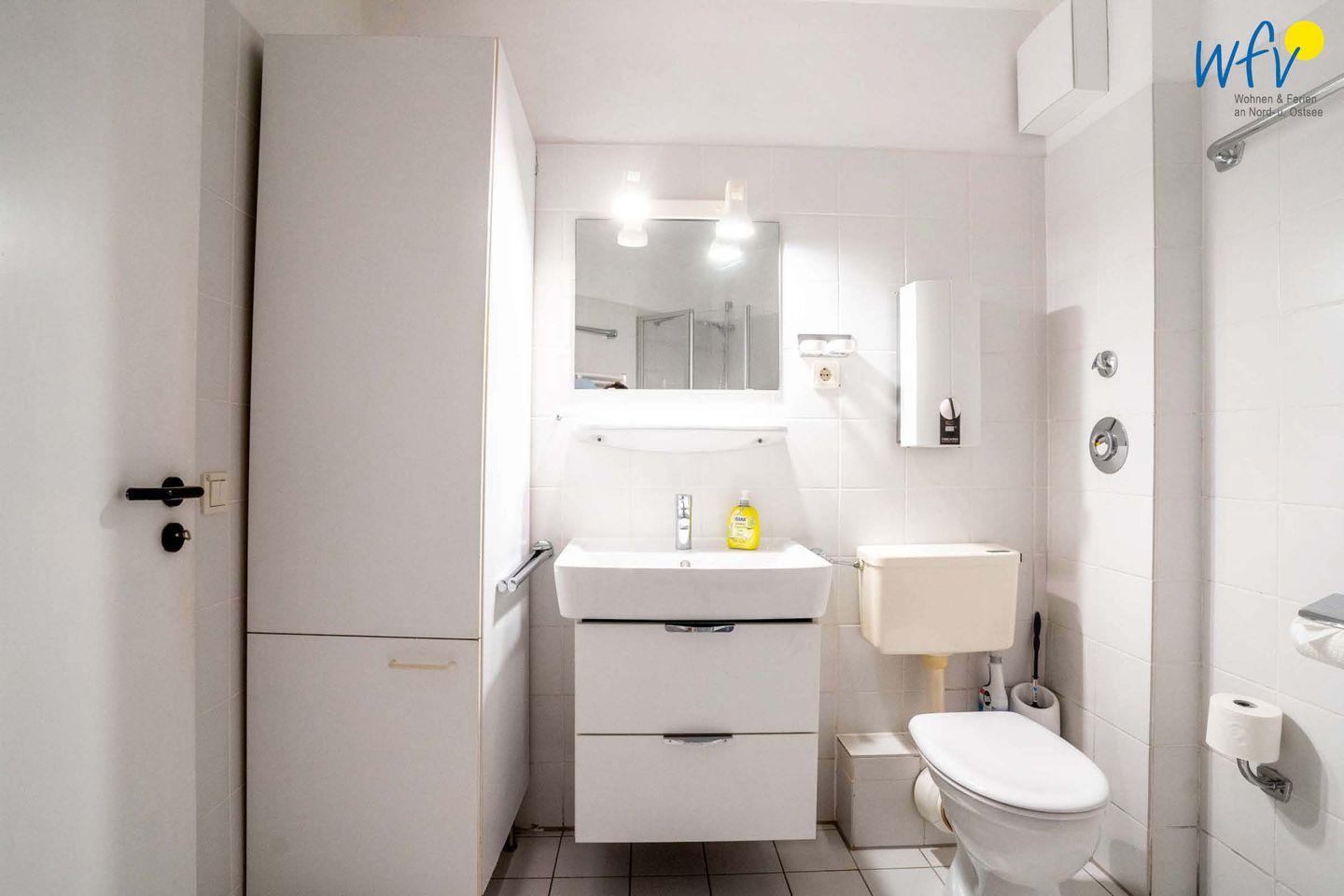 Im hell gefliesten Badezimmer der Ferienwohnung befindet sich eine Dusche, ein Waschtisch und ein WC. Ein Fön ist selbstverständlich vorhanden.
