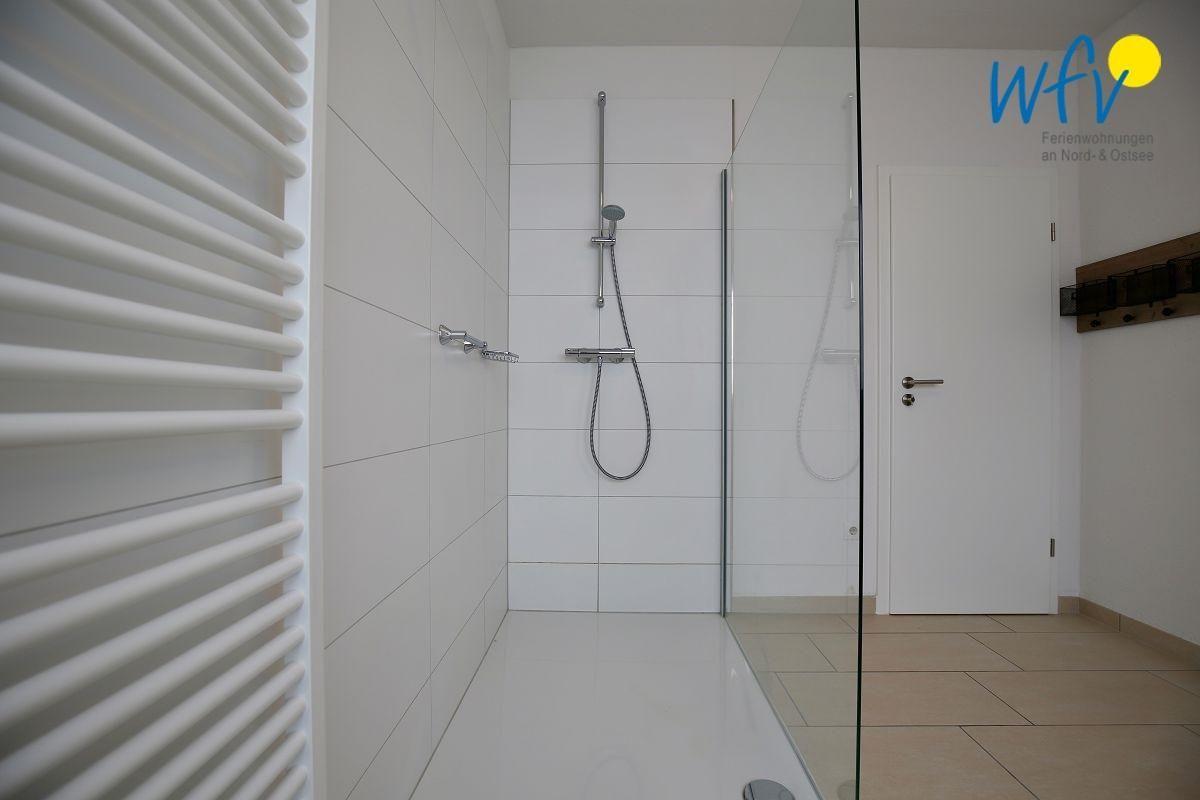 Das große gepflegte Bad verfügt über Waschbecken und WC sowie über eine ebenerdige Dusche und eine Handtuchheizung. Zusätzlich gibt es ein Gäste-WC.