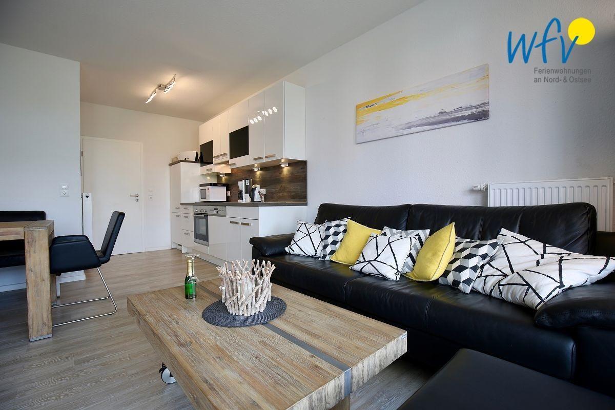 Die 86 m² große Ferienwohnung erstreckt sich über das Erd- und Untergeschoss. Im Erdgeschoss erwartet Sie ein großzügiger Wohnraum, der mit einer gemütlichen Couchecke und einem Esstisch eingerichtet ist. Hier können Sie wunderbar gemeinsame Stunden mit der gesamten Familie verbringen. Die hochwertige integrierte Einbauküche verfügt u.a. über Herd, Backofen, Mikrowelle, Geschirrspülmaschine und Kühlschrank (mit Gefrierfach).