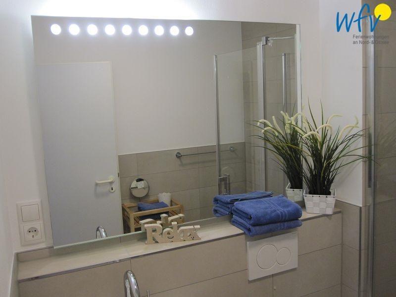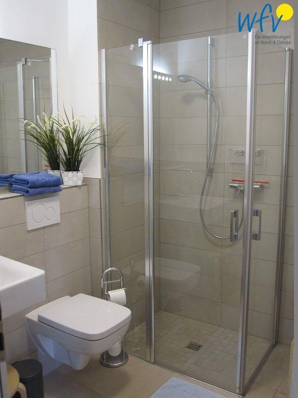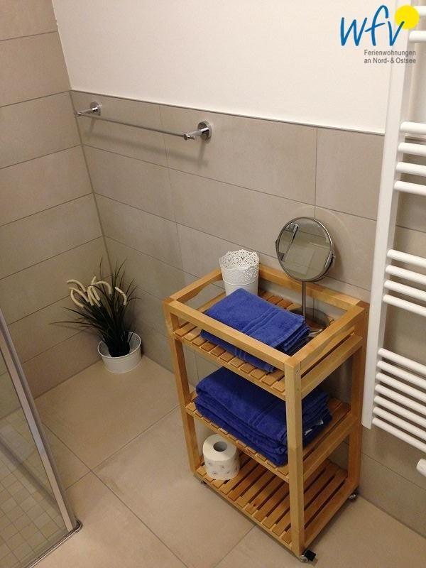 Das moderne Bad ist u.a. mit einer voll verglasten ebenerdigen Dusche ausgestattet. Liebevolle Accessoires machen auch diesen Raum zu einem Wohlfühlort.