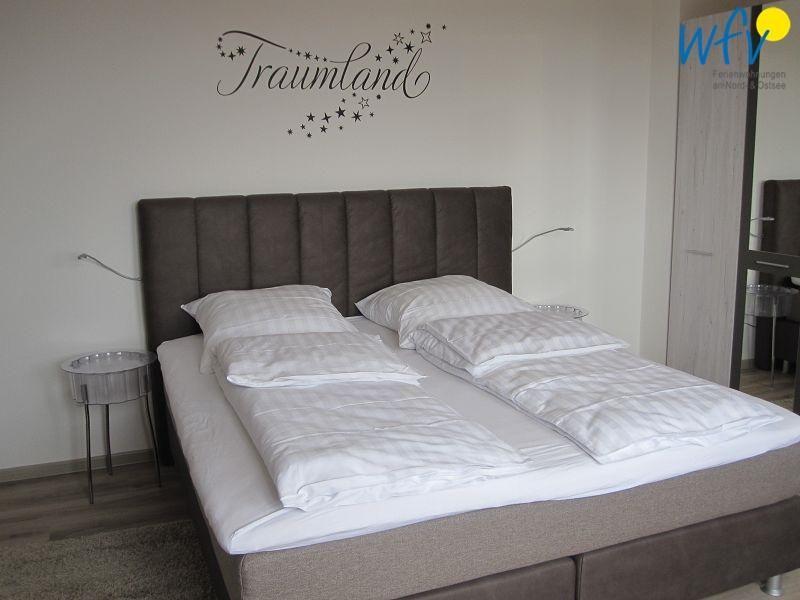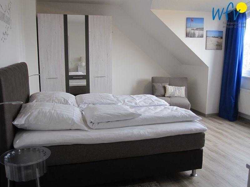 In dem separaten Schlafzimmer der Ferienwohnung auf Wangerooge erwarten Sie zwei moderne ausziehbare Schlafsessel und ein komfortables Box-Springbett. Auch hier befindet sich ein TV. Durch die großen Fenster und den schönen Blick nach draußen werden Sie bereits beim Aufstehen entspannt in den neuen Urlaubstag starten.