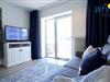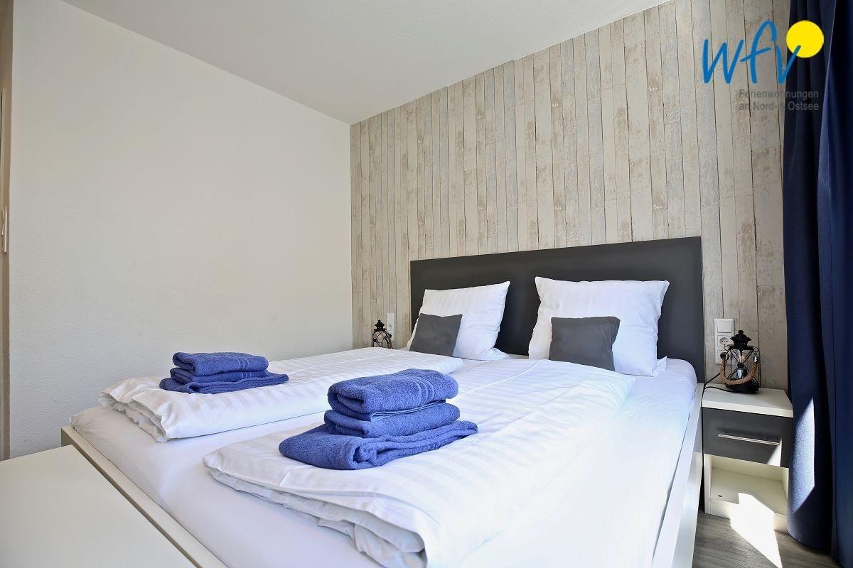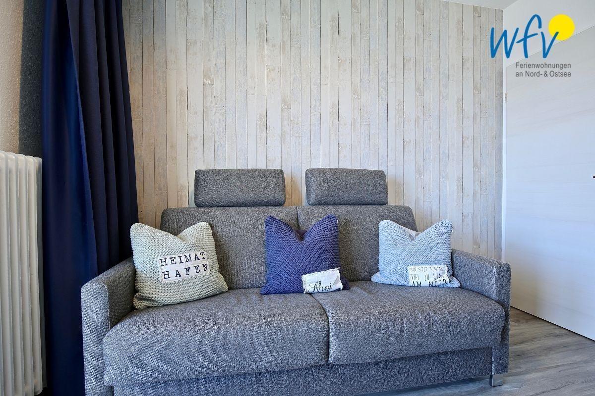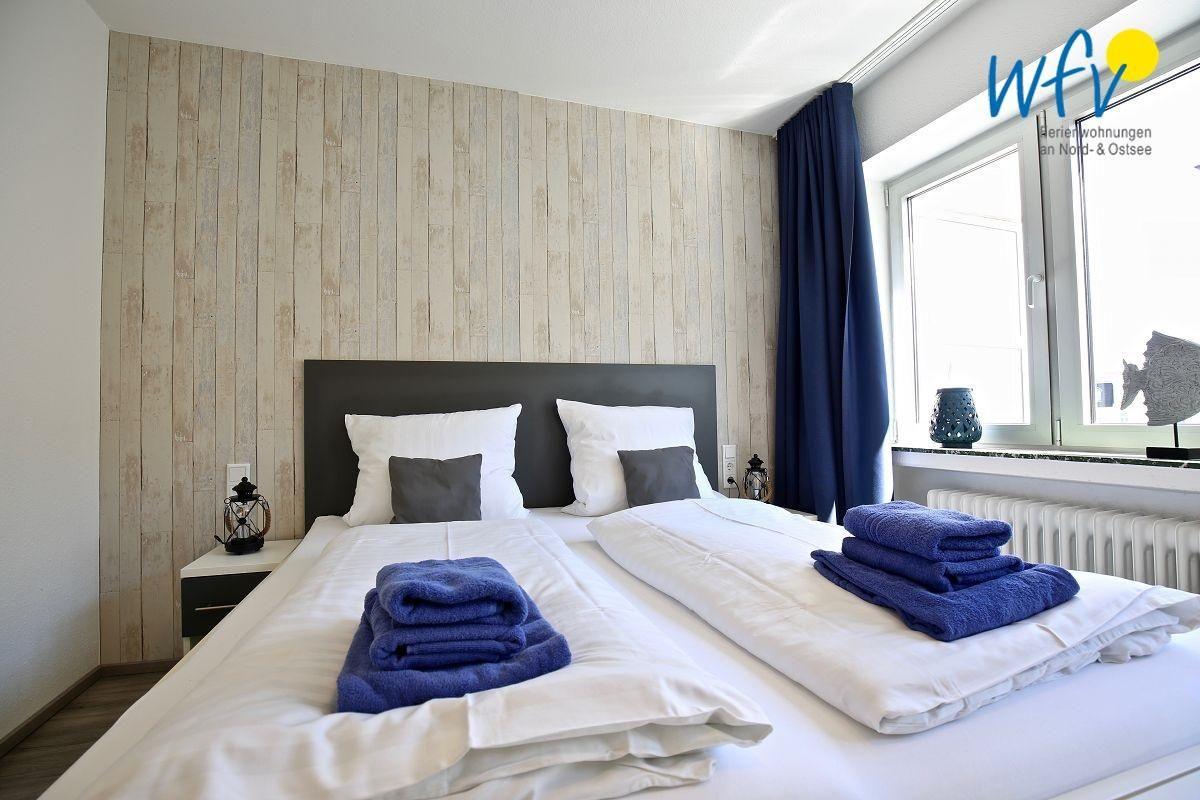 Das separate Schlafzimmer der Wangerooger Ferienwohnung ist mit einem Doppelbett (90 x 200 cm) und einem weiteren Flachbildfernseher ausgestattet. Platz für zwei weitere Personen besteht durch eine Schlafcouch (2 x 70 cm).