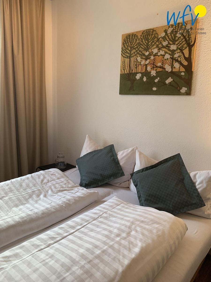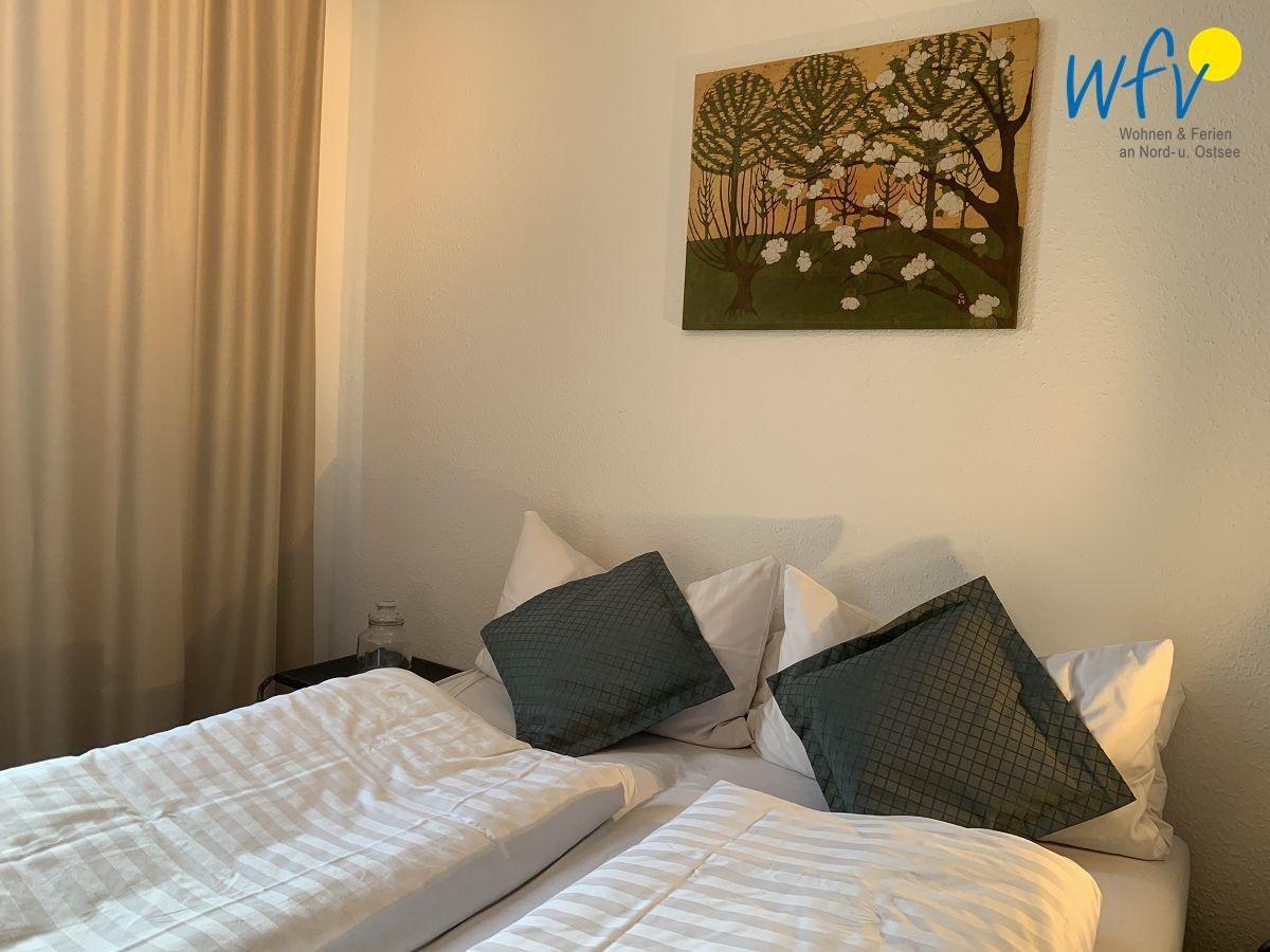 In dem separaten Schlafzimmer der Ferienwohnung auf Wangerooge befindet sich ein Doppelbett (1,60 m x 2,00 m) für zwei Personen. Weitere Schlafmöglichkeiten für zwei Personen bietet eine Schlafcouch im Wohnzimmer.